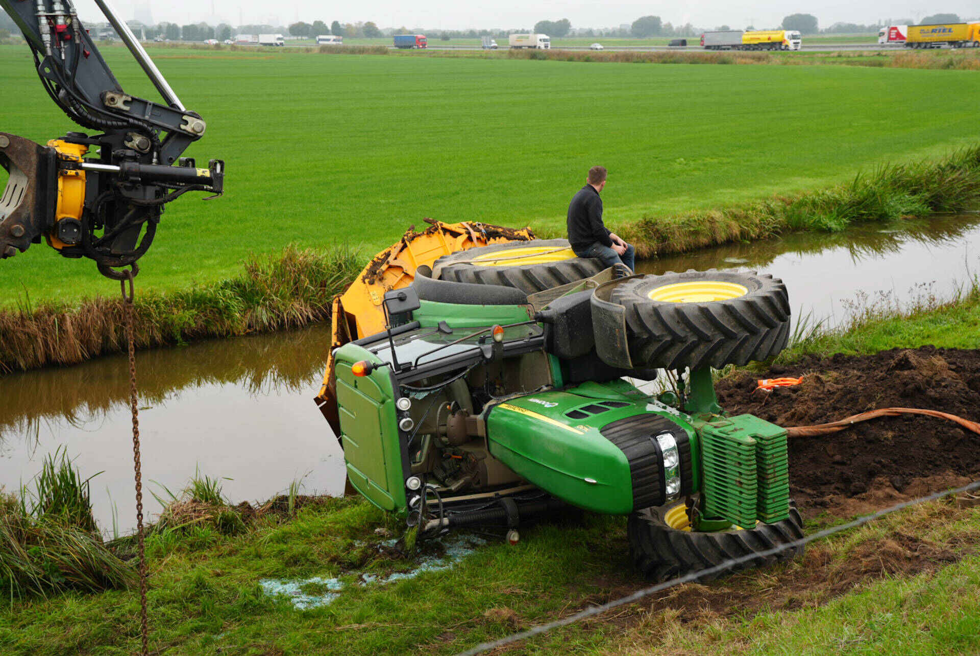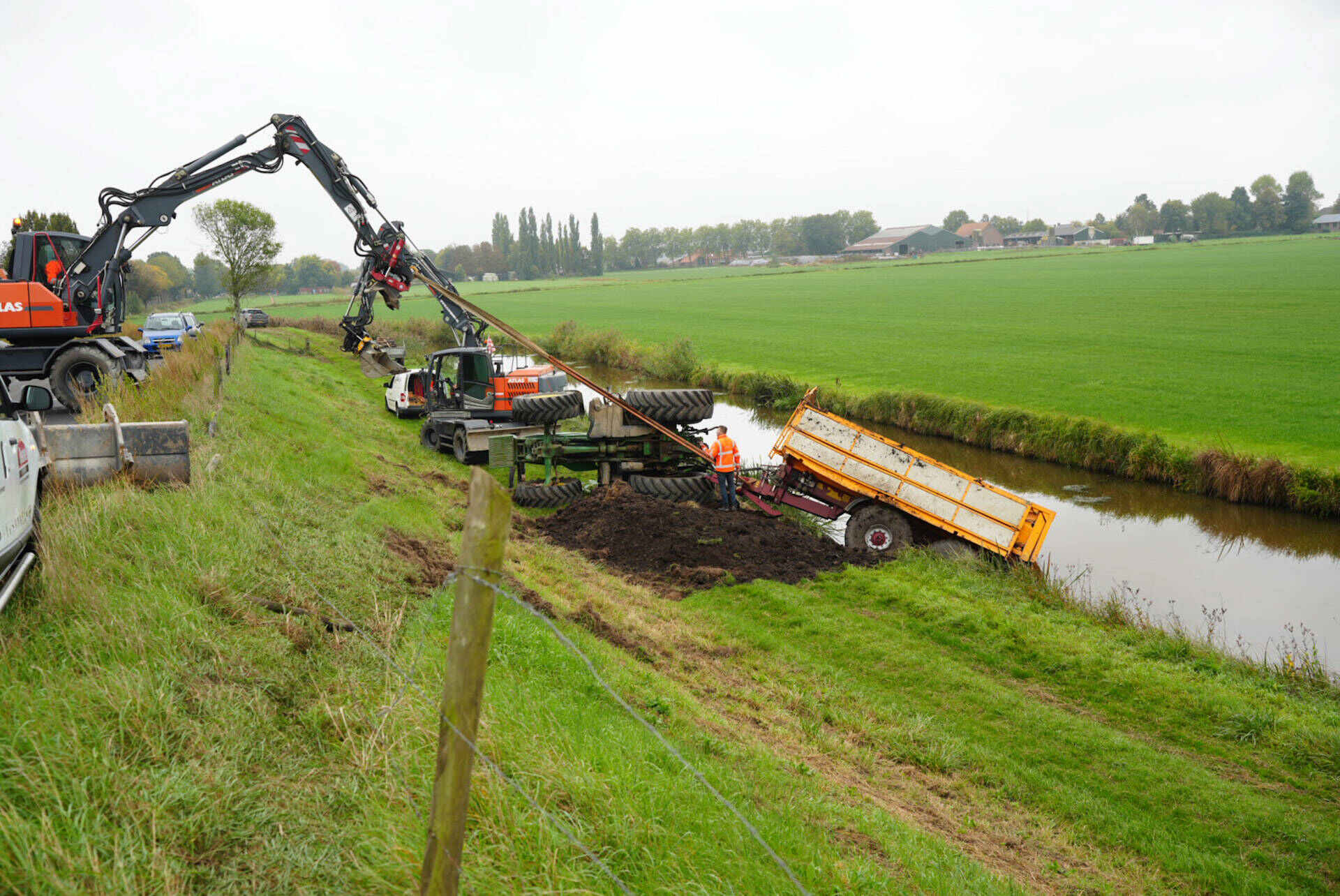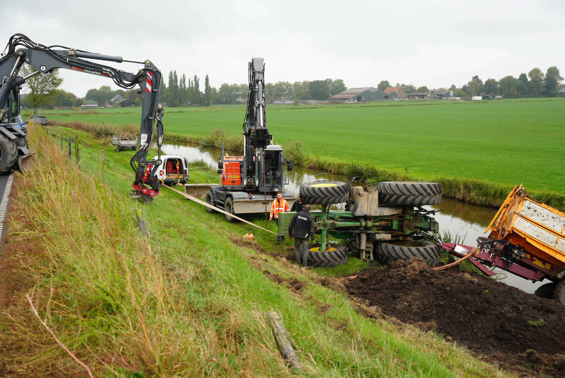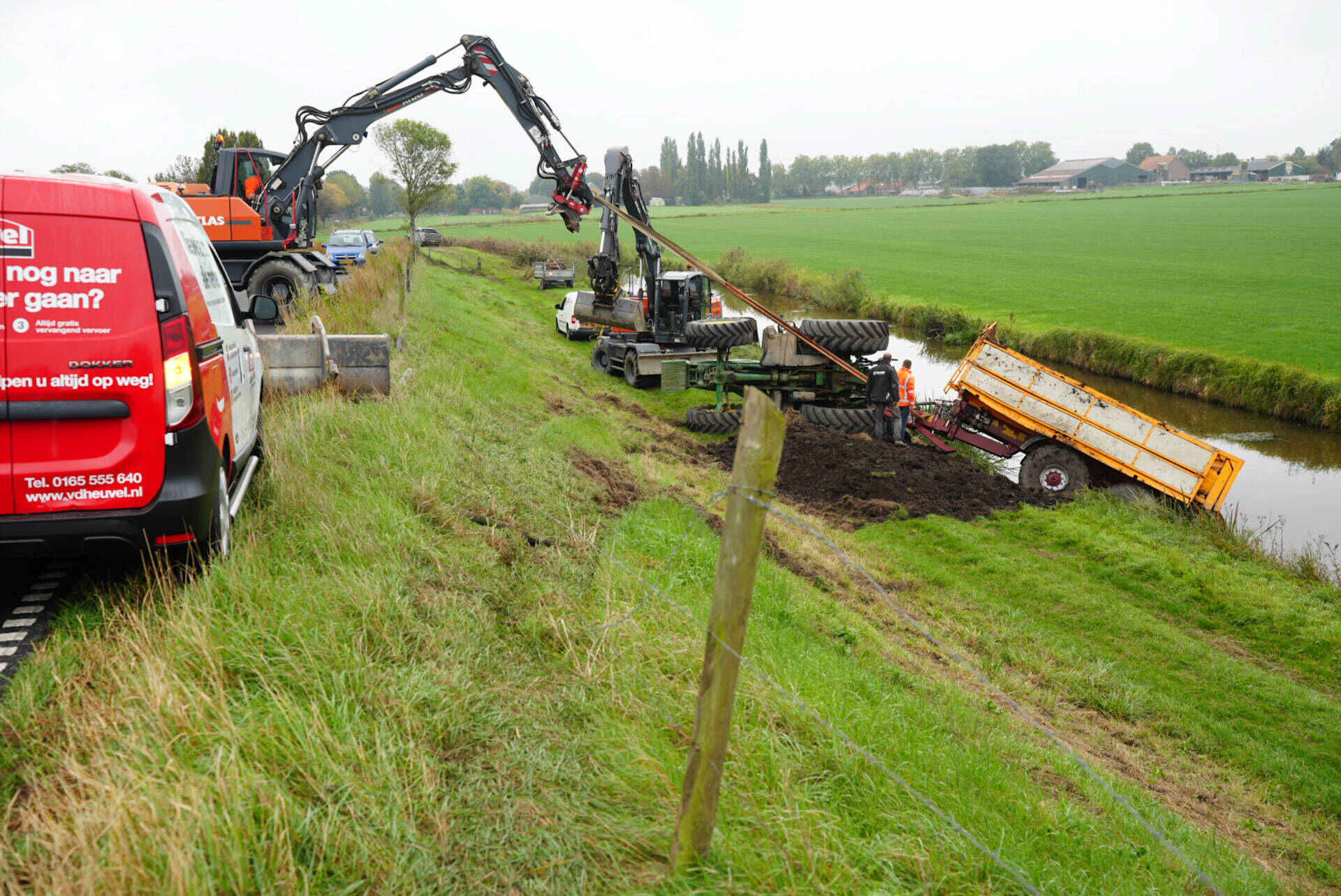 De tractor vervoerde een kiepkar toen het misging op de Zijlweg tussen Waspik en Raamsdonk. De tractor kwam op zijn kant te liggen, terwijl de aanhanger met tien kubieke meter grond in het water belandde. Een loonbedrijf heeft met kranen de combinatie overeind gezet en uit het zand getrokken.