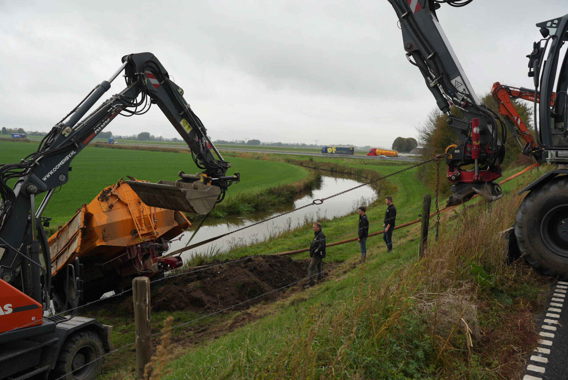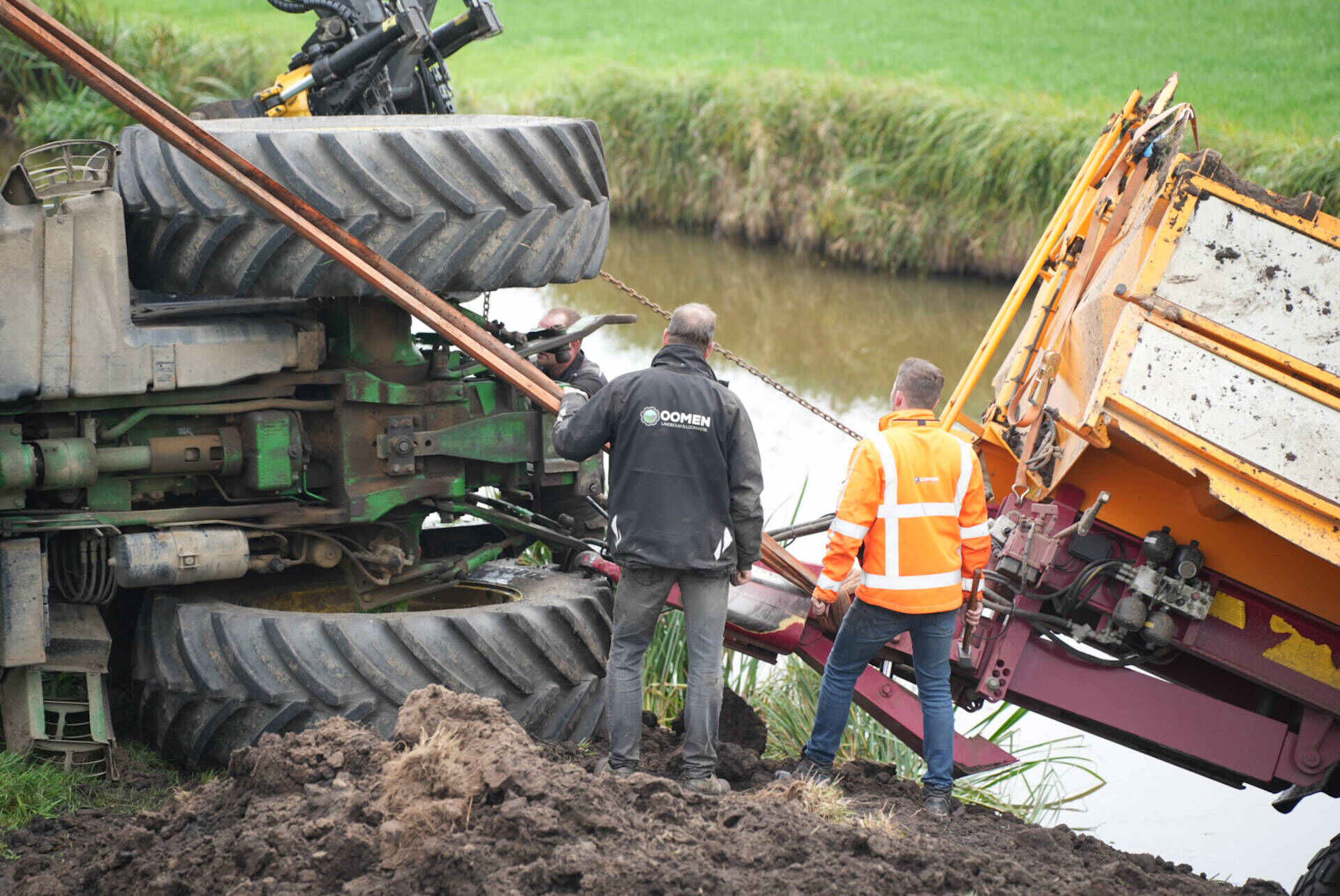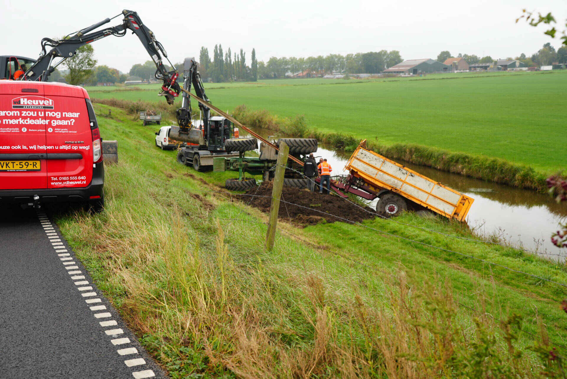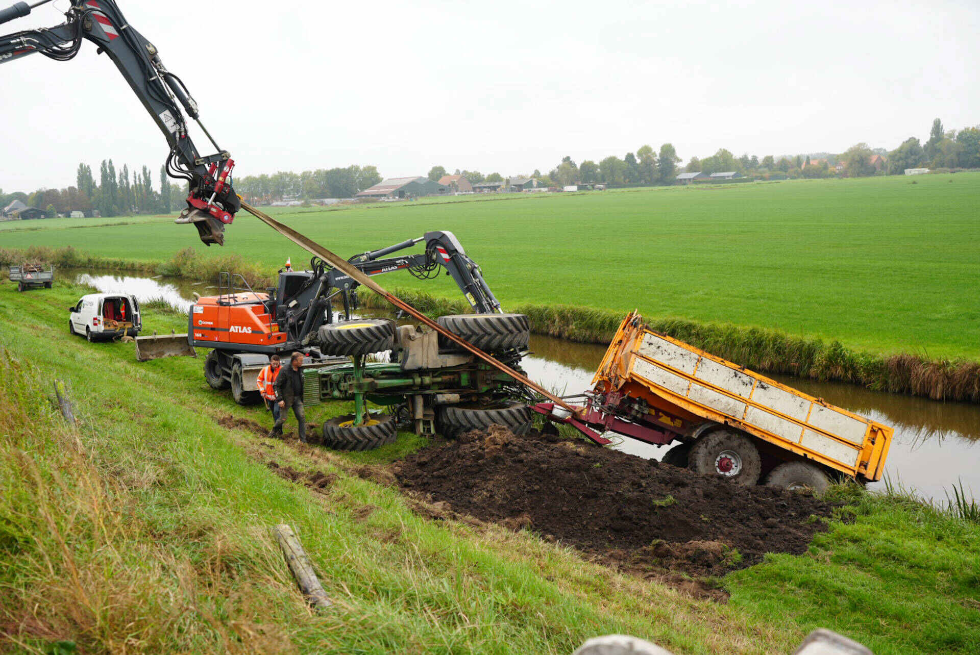 De tractor vervoerde een kiepkar toen het misging op de Zijlweg tussen Waspik en Raamsdonk. De tractor kwam op zijn kant te liggen, terwijl de aanhanger met tien kubieke meter grond in het water belandde. Een loonbedrijf heeft met kranen de combinatie overeind gezet en uit het zand getrokken.