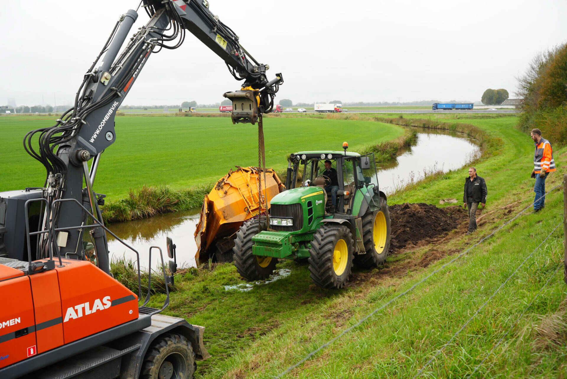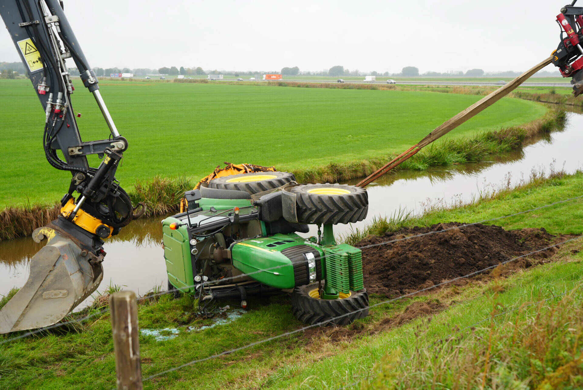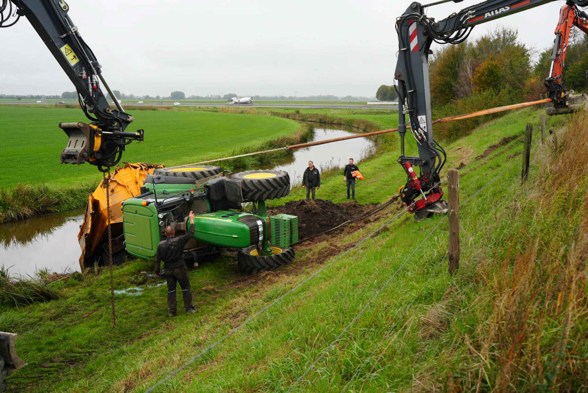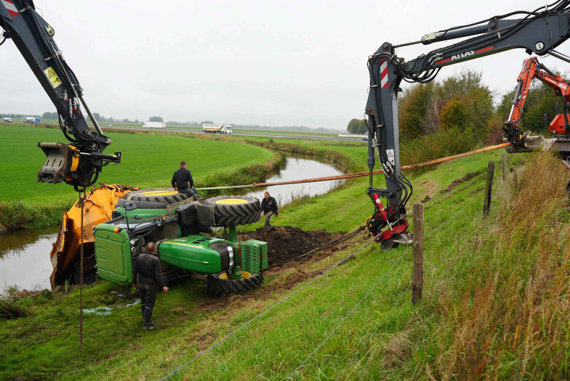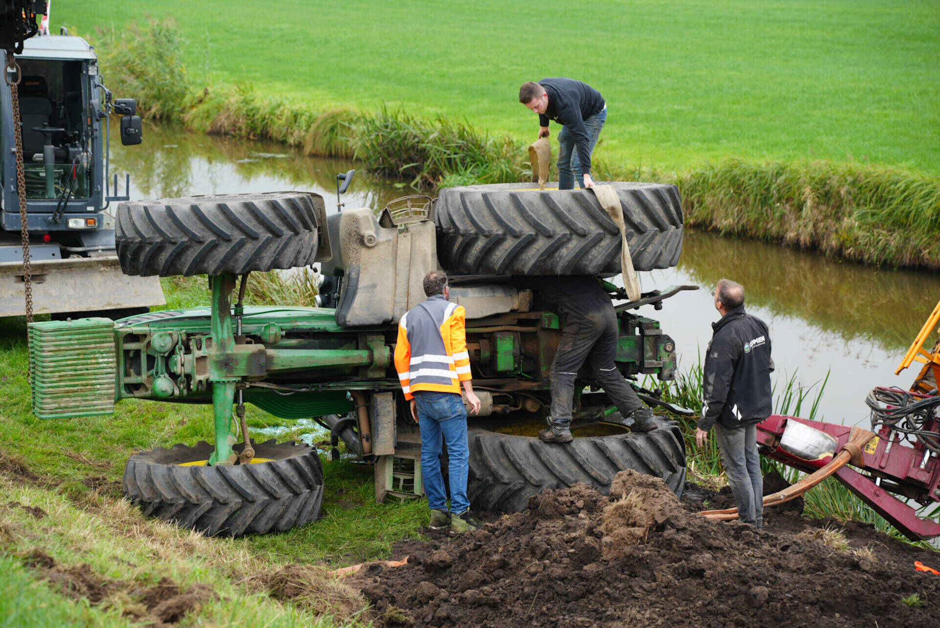 De tractor vervoerde een kiepkar toen het misging op de Zijlweg tussen Waspik en Raamsdonk. De tractor kwam op zijn kant te liggen, terwijl de aanhanger met tien kubieke meter grond in het water belandde. Een loonbedrijf heeft met kranen de combinatie overeind gezet en uit het zand getrokken.
