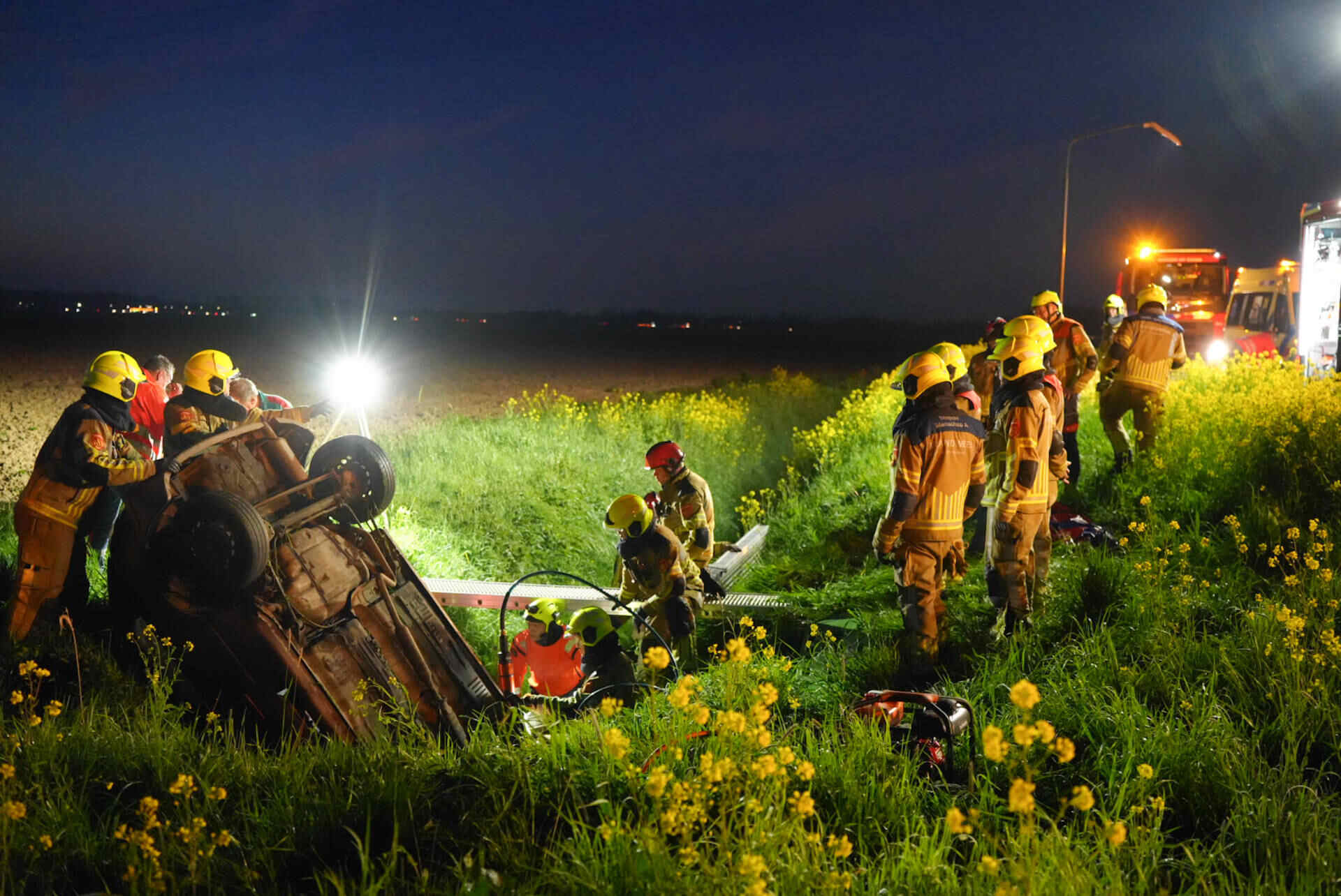 Het bleek lastig om de man uit de auto te krijgen, waarop de brandweer besloot om een deur uit het voertuig te knippen. De zwaargewonde man, die aanspreekbaar was, werd daarna met spoed naar het ziekenhuis gebracht.