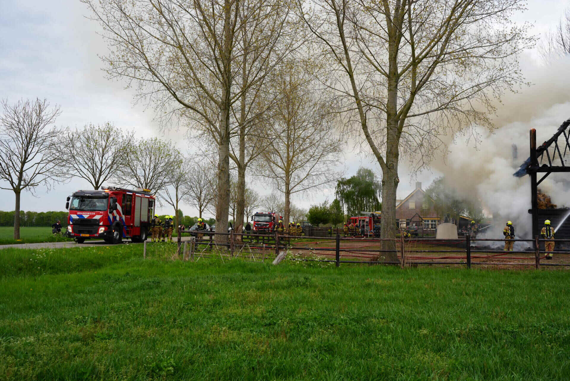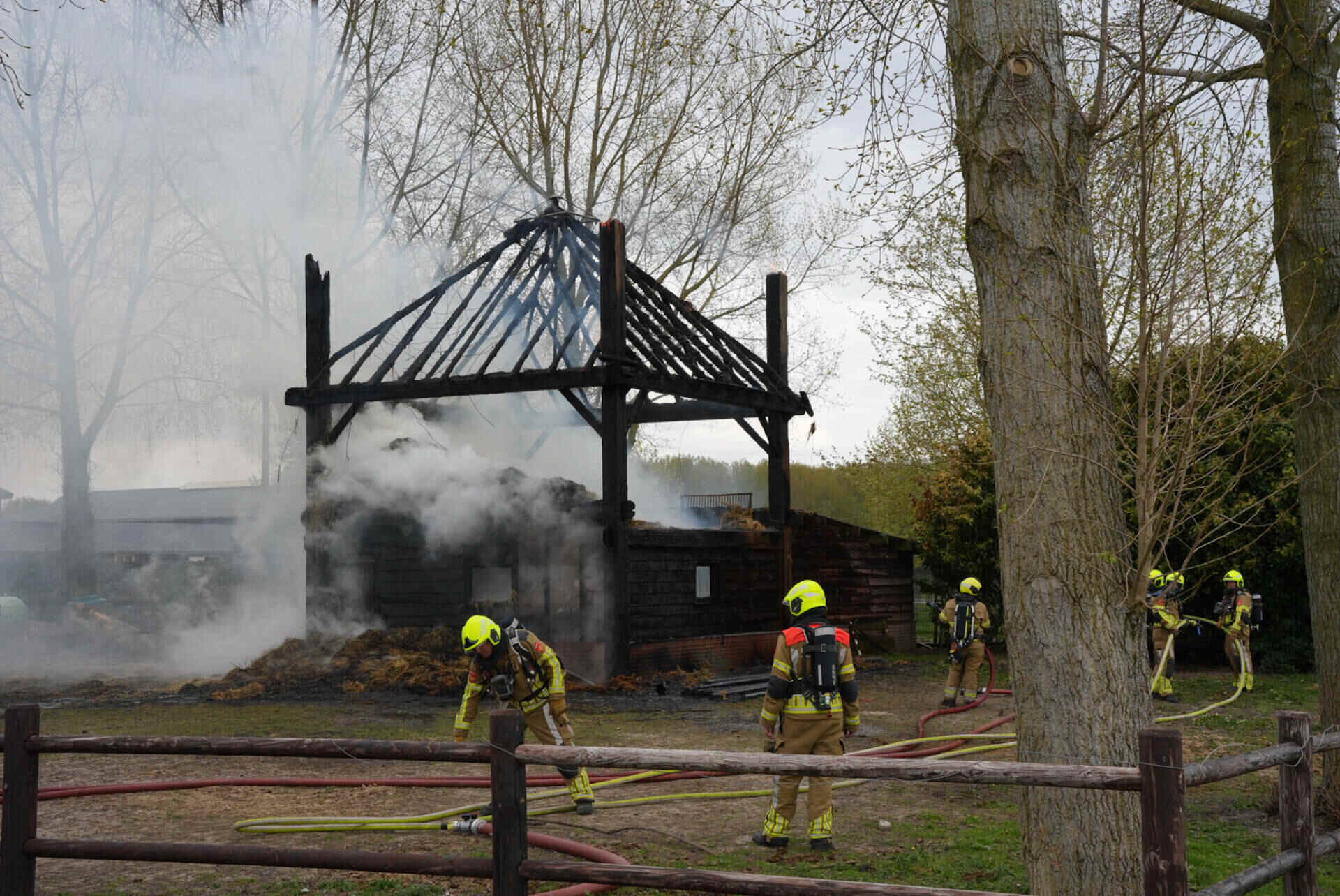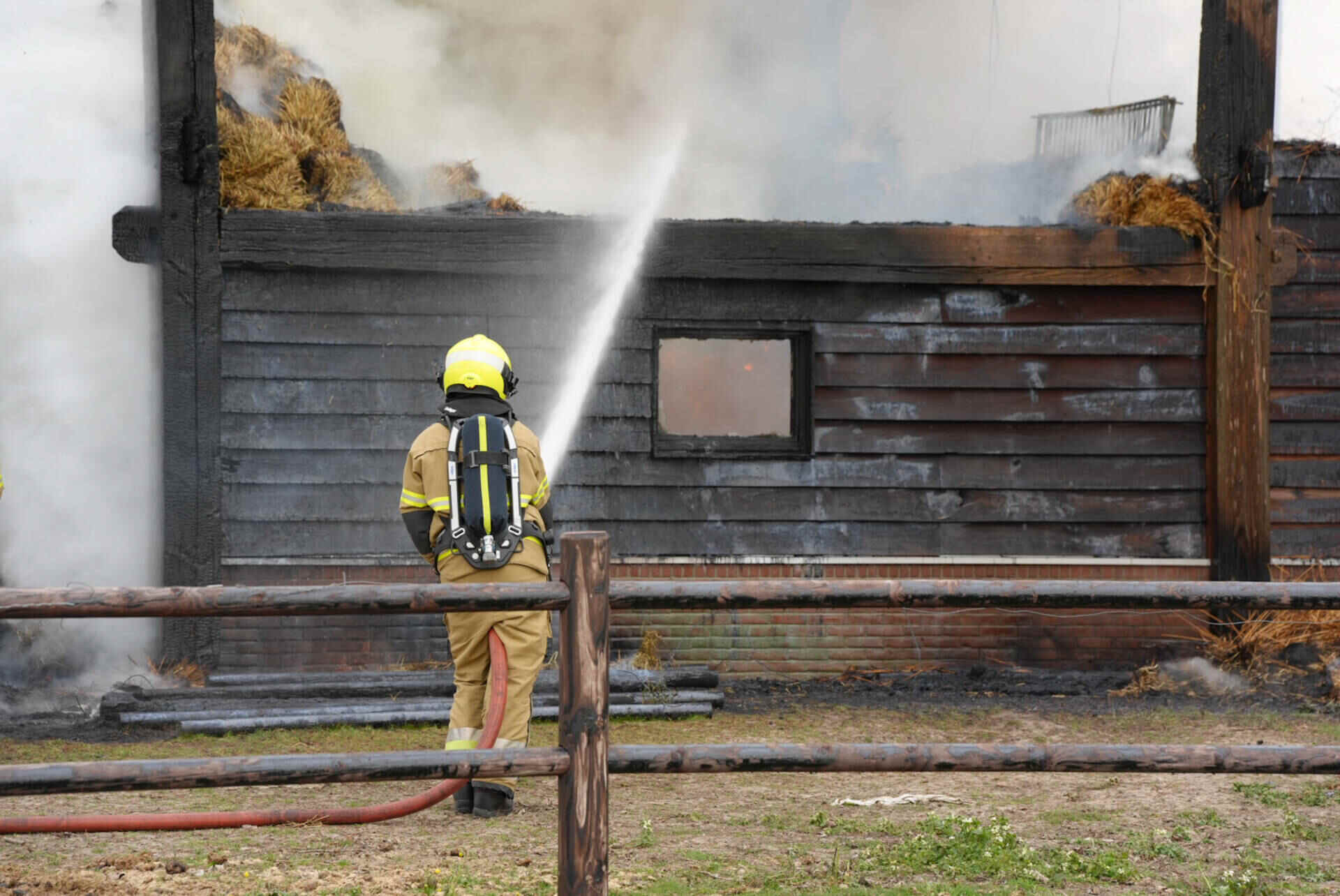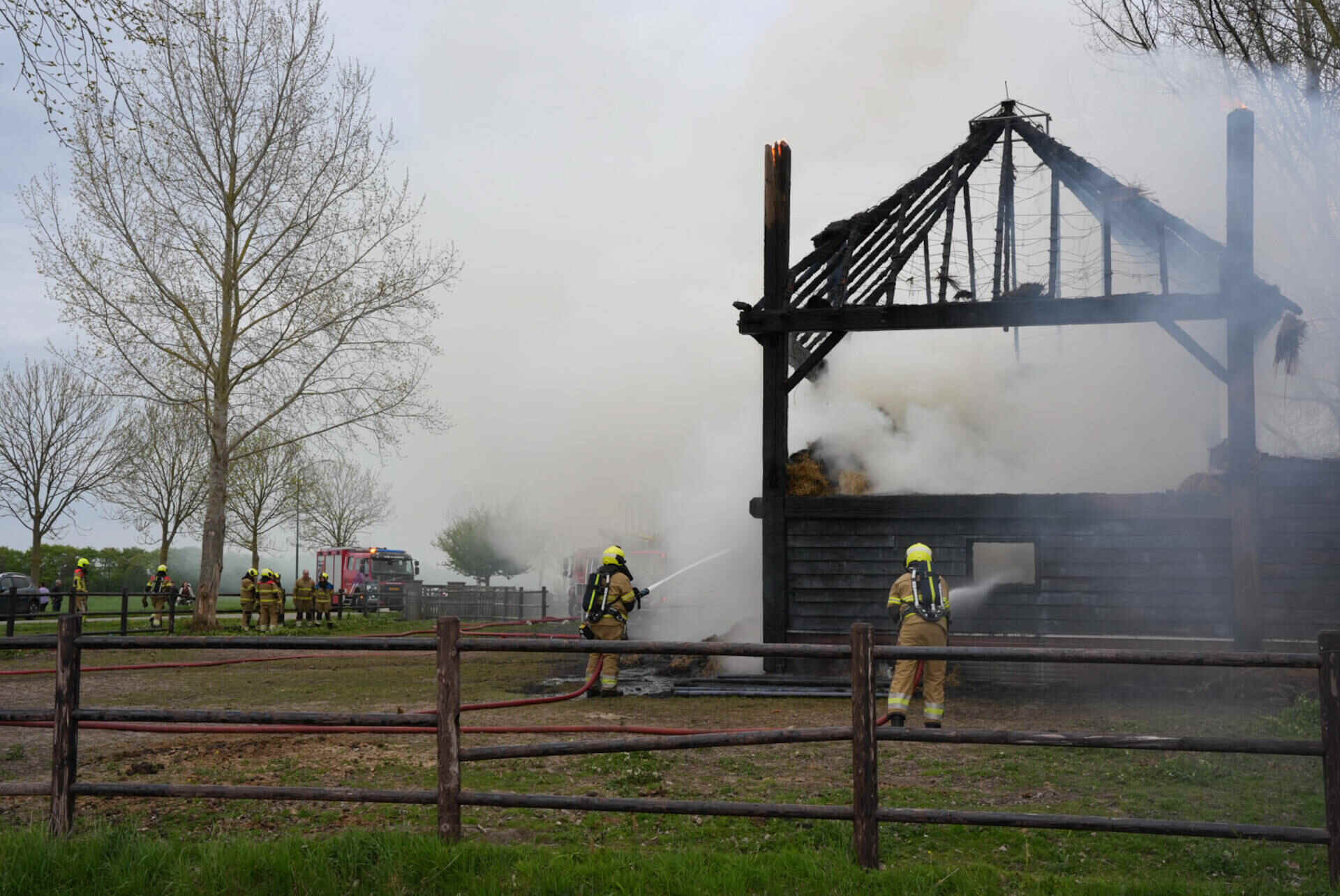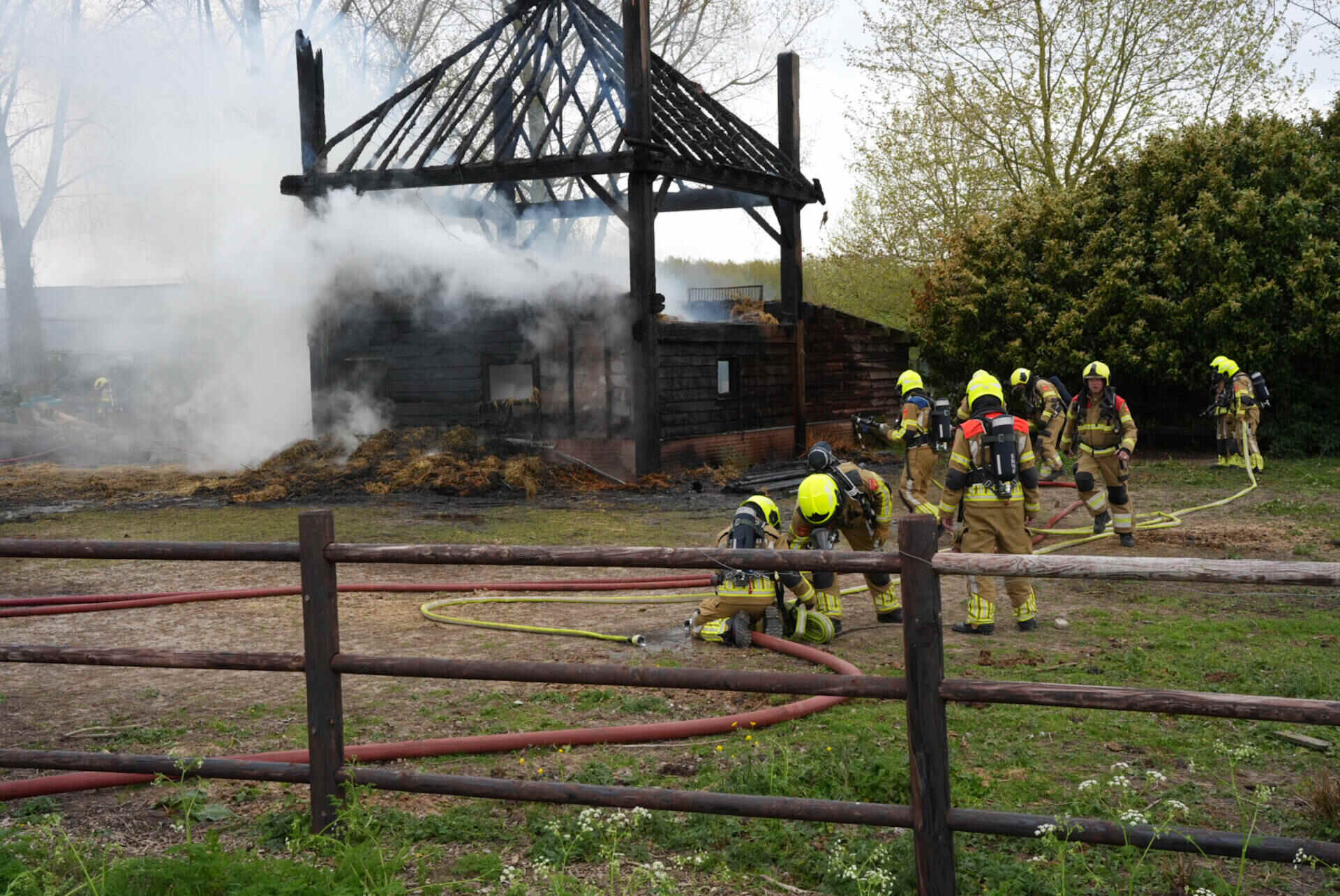 De brandweer had het vuur snel onder controle, maar kon niet voorkomen dat de hooischuur afbrandde. Er kwam veel rook van de smeulende hooiberg af, wat leidde tot de oproep dat omwonenden hun ramen en deuren moesten sluiten.