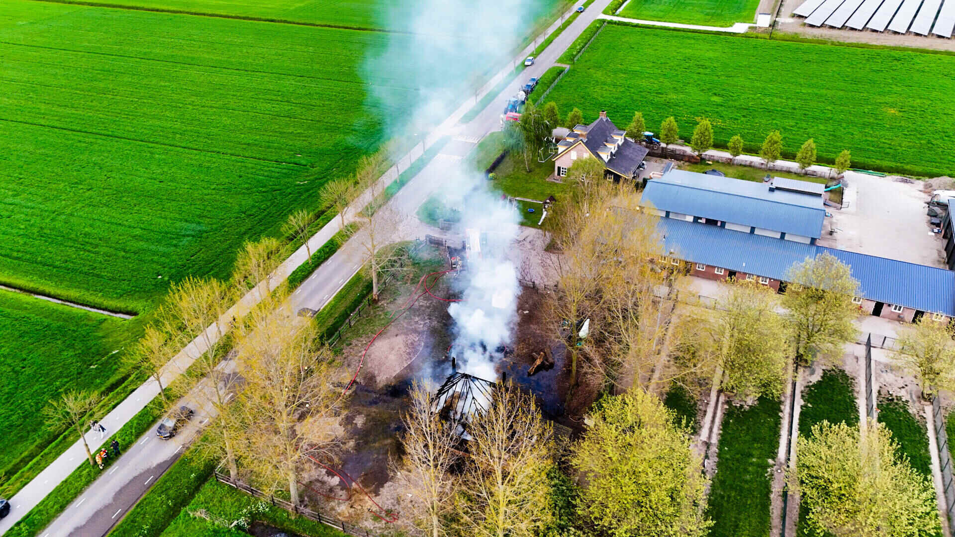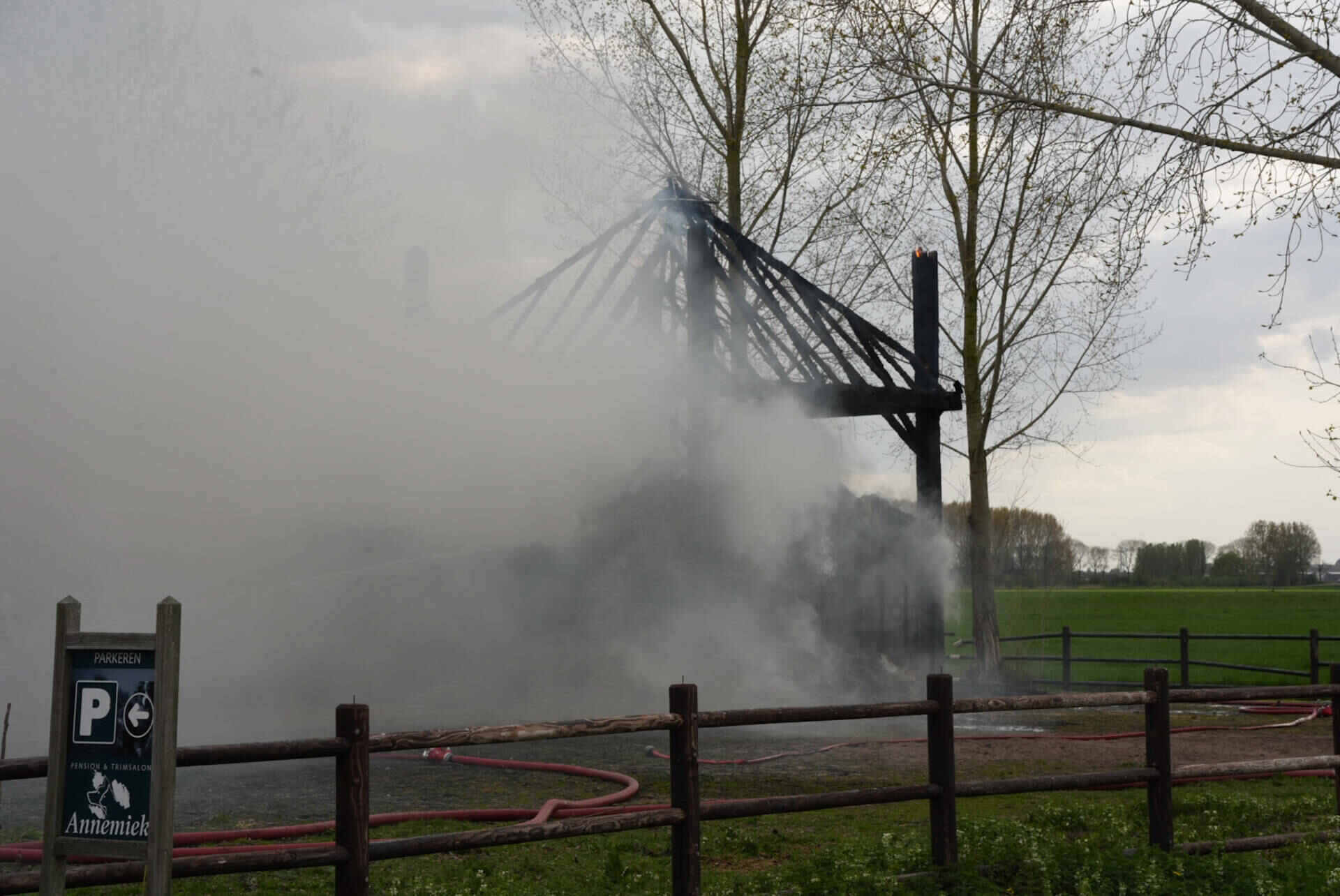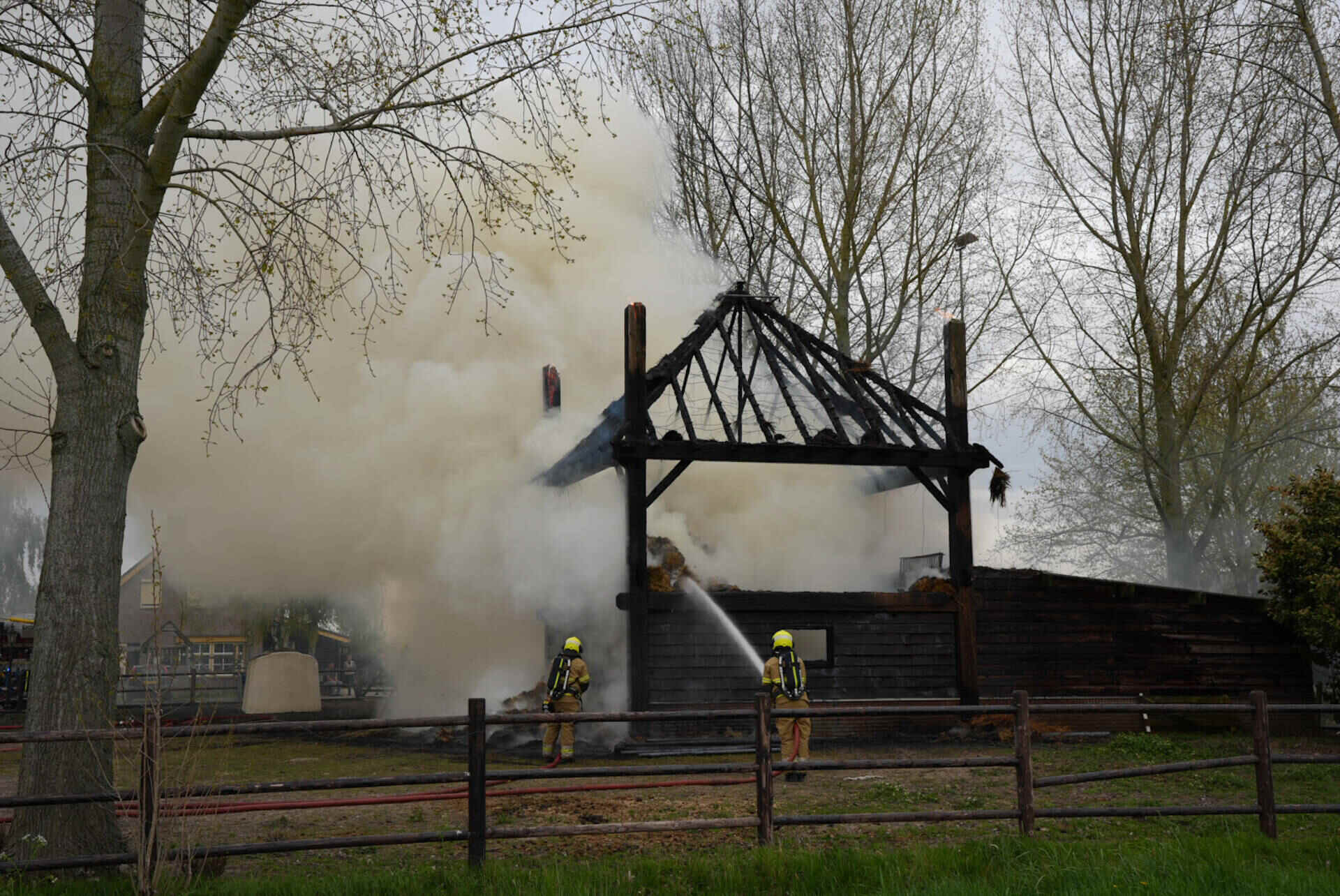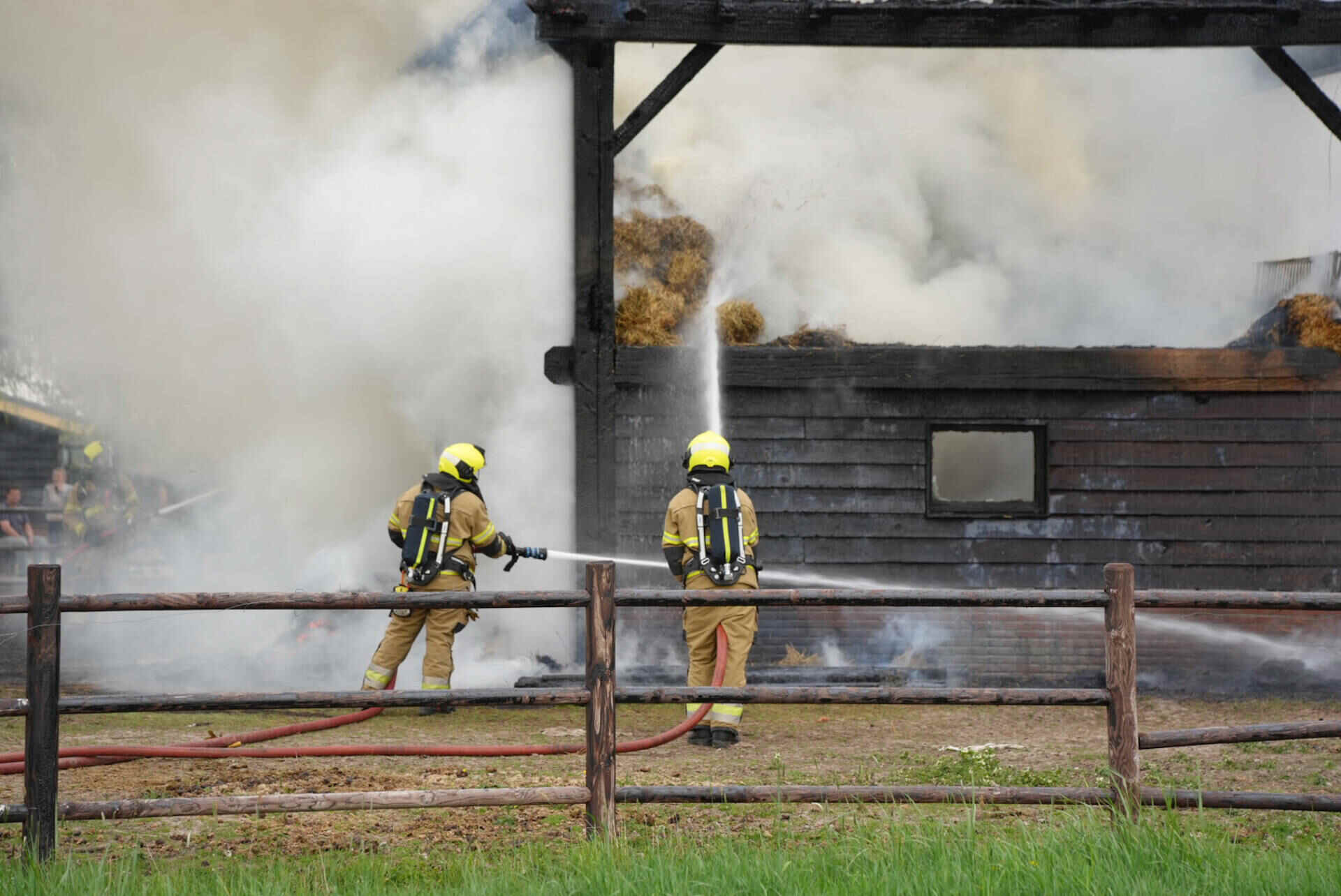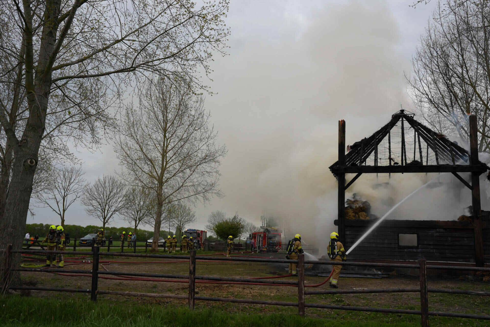 De brandweer had het vuur snel onder controle, maar kon niet voorkomen dat de hooischuur afbrandde. Er kwam veel rook van de smeulende hooiberg af, wat leidde tot de oproep dat omwonenden hun ramen en deuren moesten sluiten.