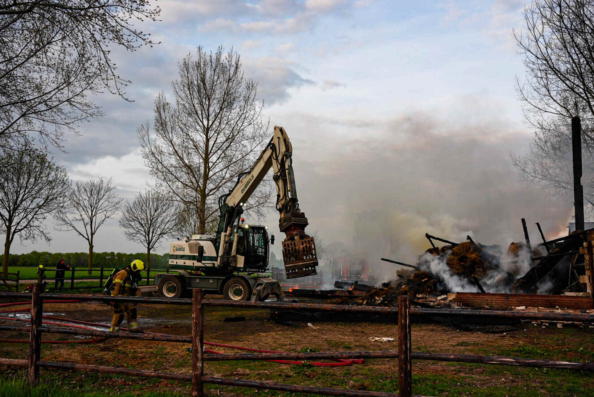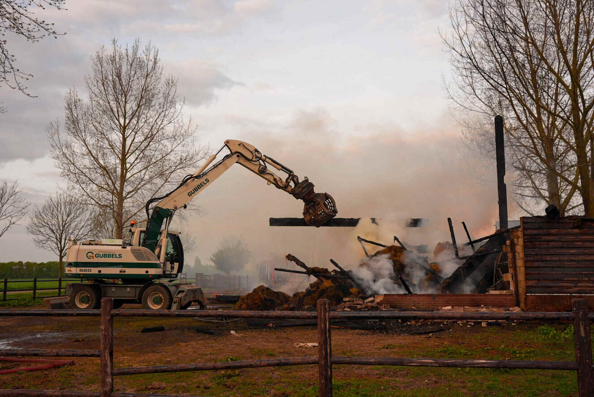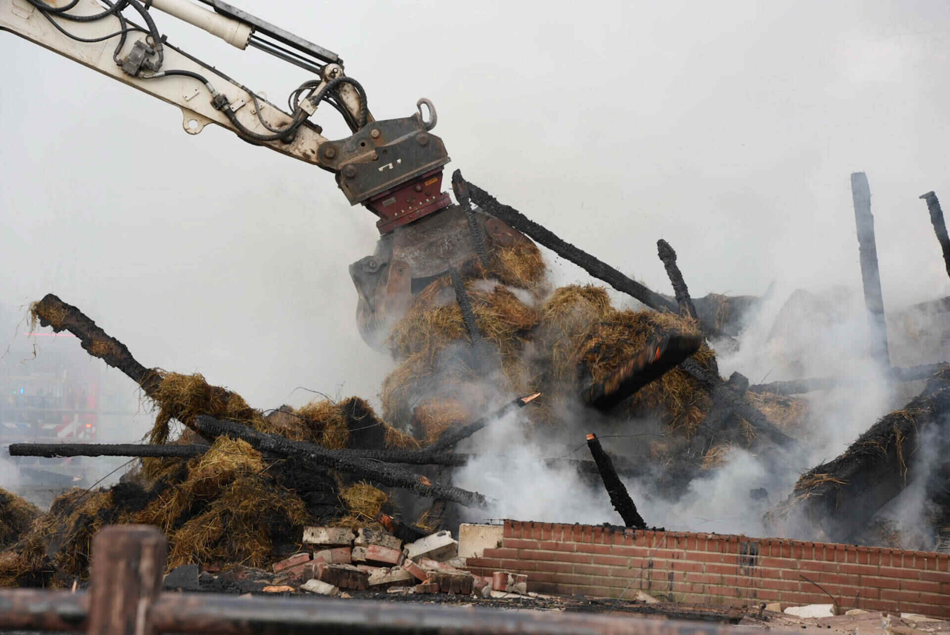 Brandweerlieden haalden de hooiberg, waar het vuur als eerst in oplaaide, helemaal uit elkaar om te voorkomen dat de vlammen weer oplaaien. Dat werd gedaan met een speciaal opgeroepen kraanwagen.