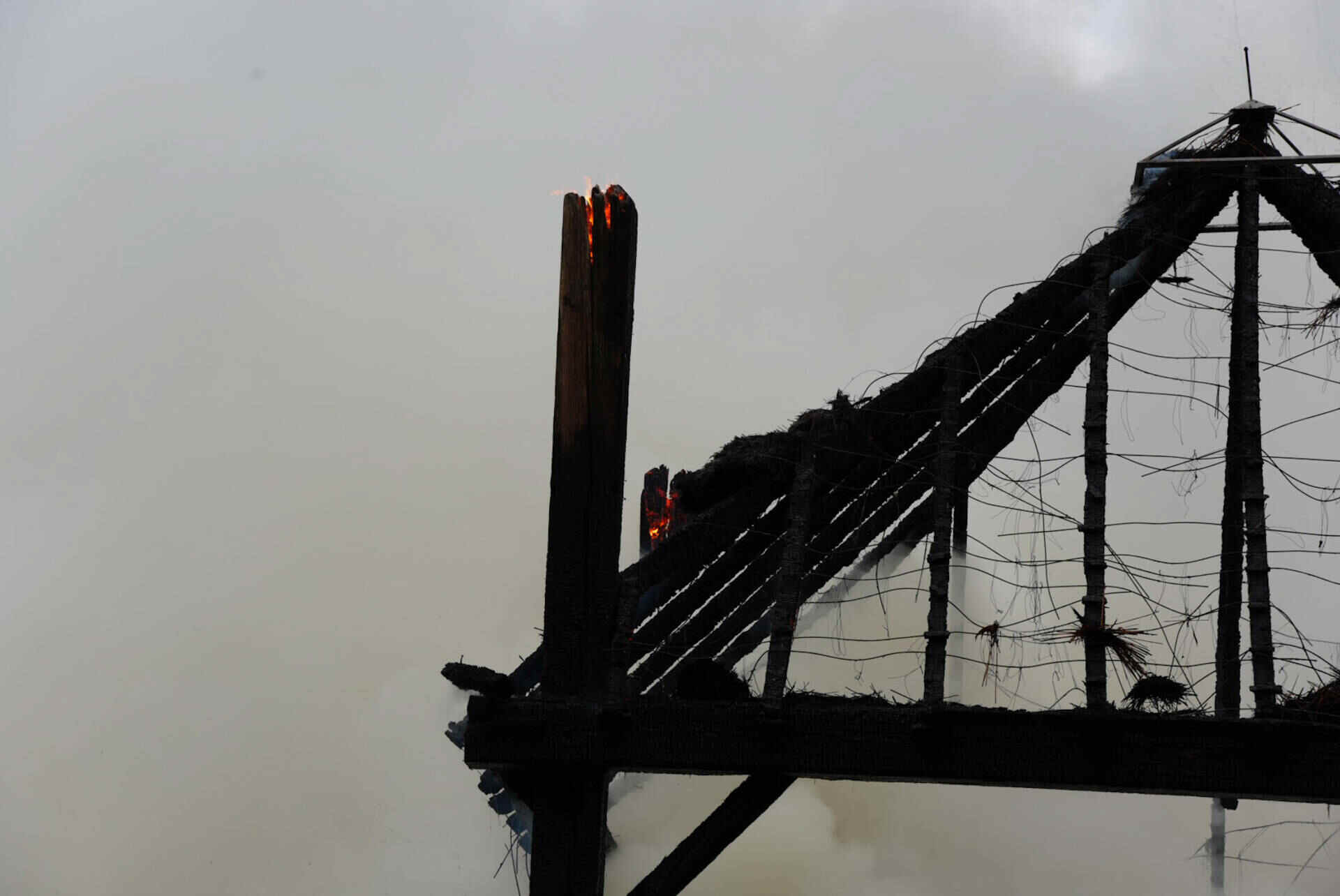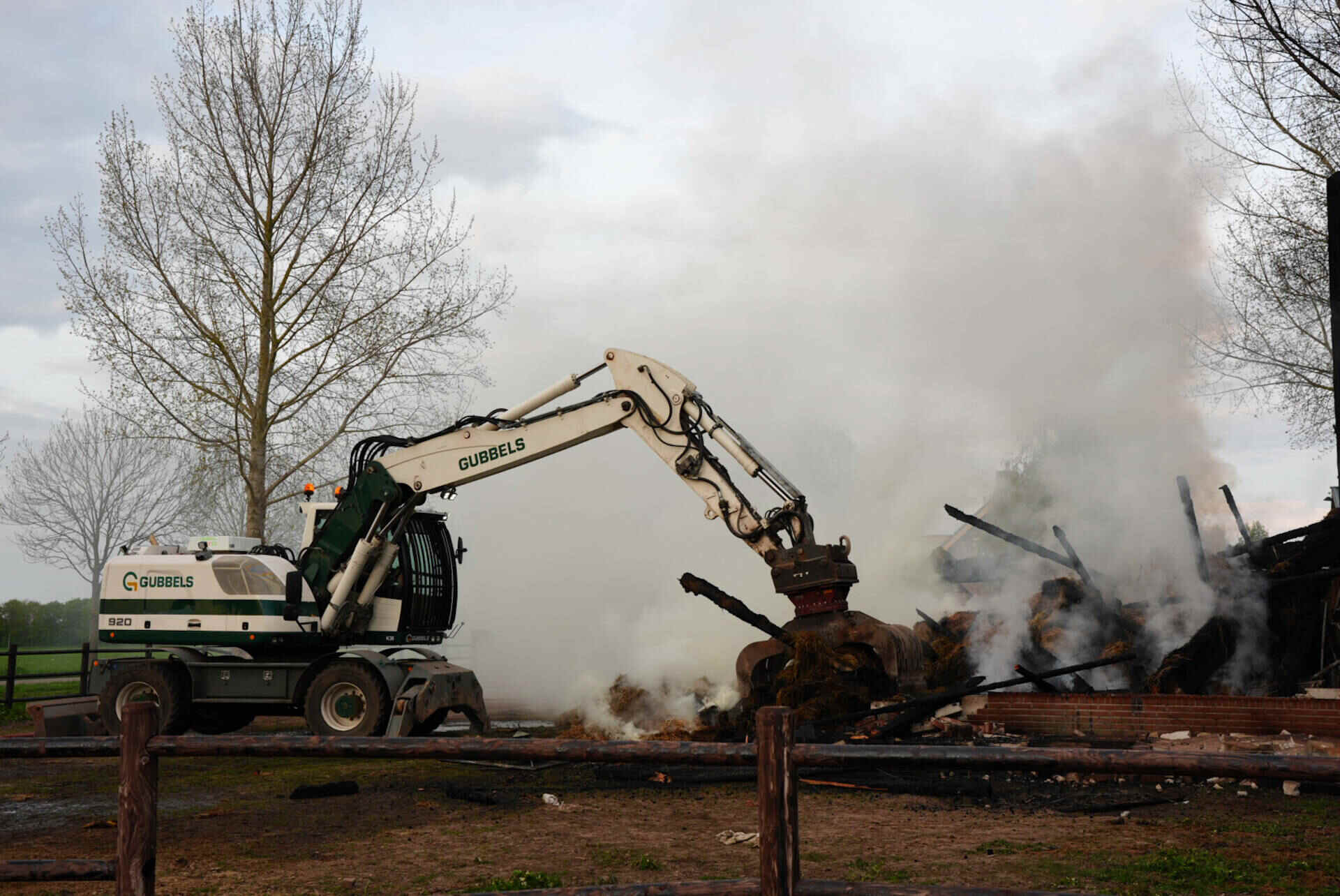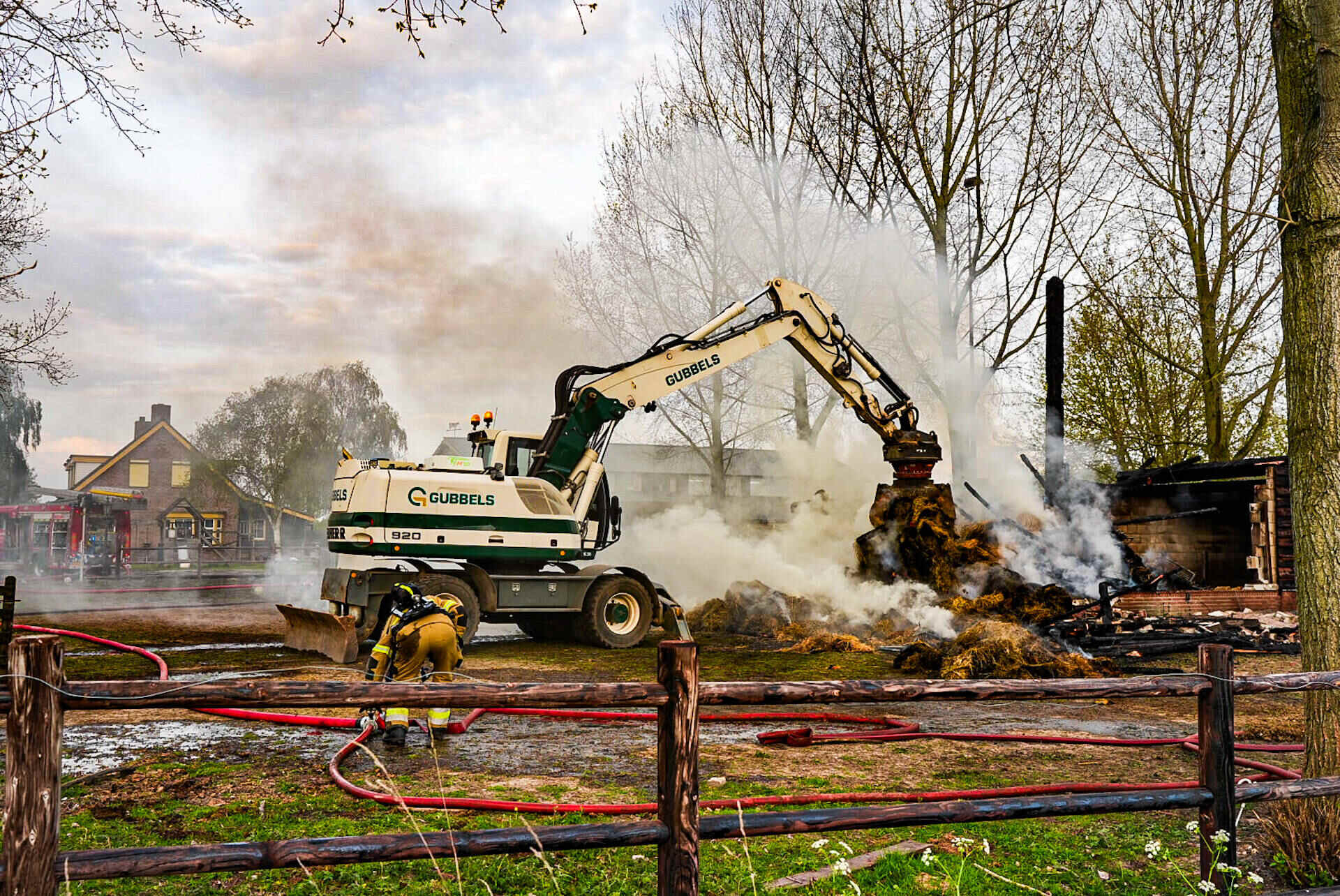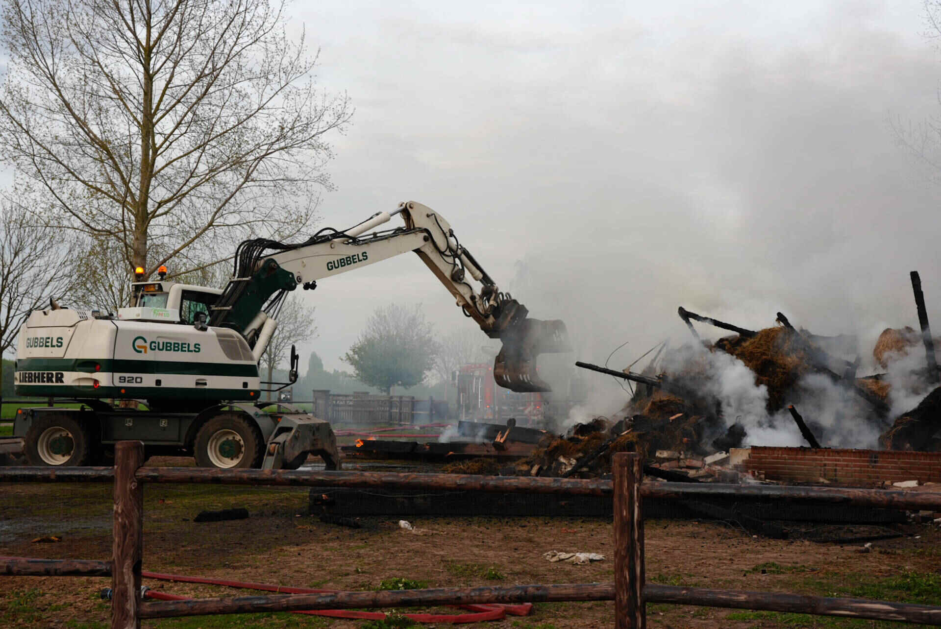 Brandweerlieden haalden de hooiberg, waar het vuur als eerst in oplaaide, helemaal uit elkaar om te voorkomen dat de vlammen weer oplaaien. Dat werd gedaan met een speciaal opgeroepen kraanwagen.