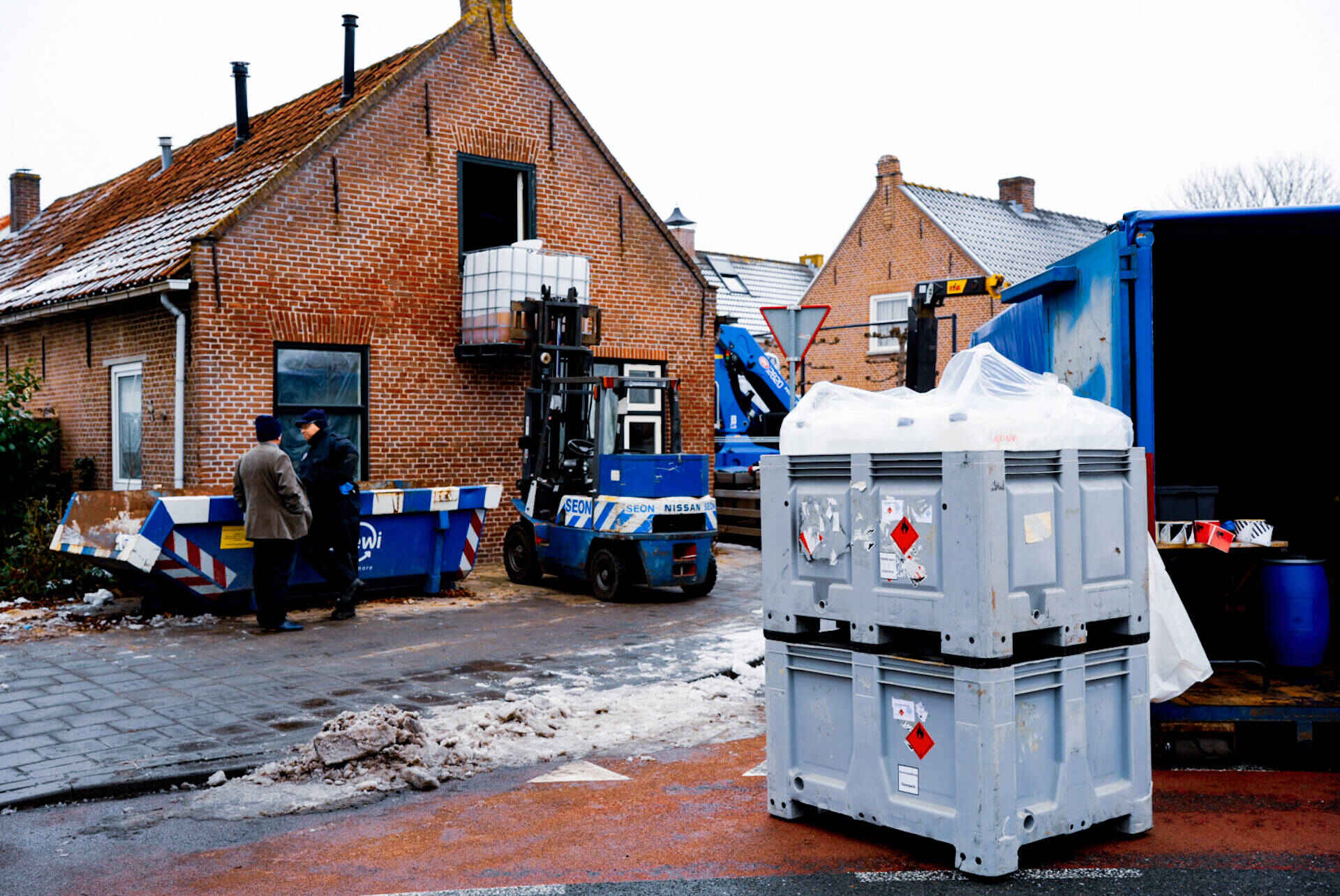 Vanwege die gevaarlijke stoffen mag niemand het pand betreden. De straat is op het moment daarom deels afgezet. Op de zolder staan meerdere vaten met chemicaliën. Die worden vandaag en anders morgen weggehaald. Daarvoor is de Landelijke Faciliteit Ontmantelen (LFO) aanwezig en met drie busjes ter plaatse.