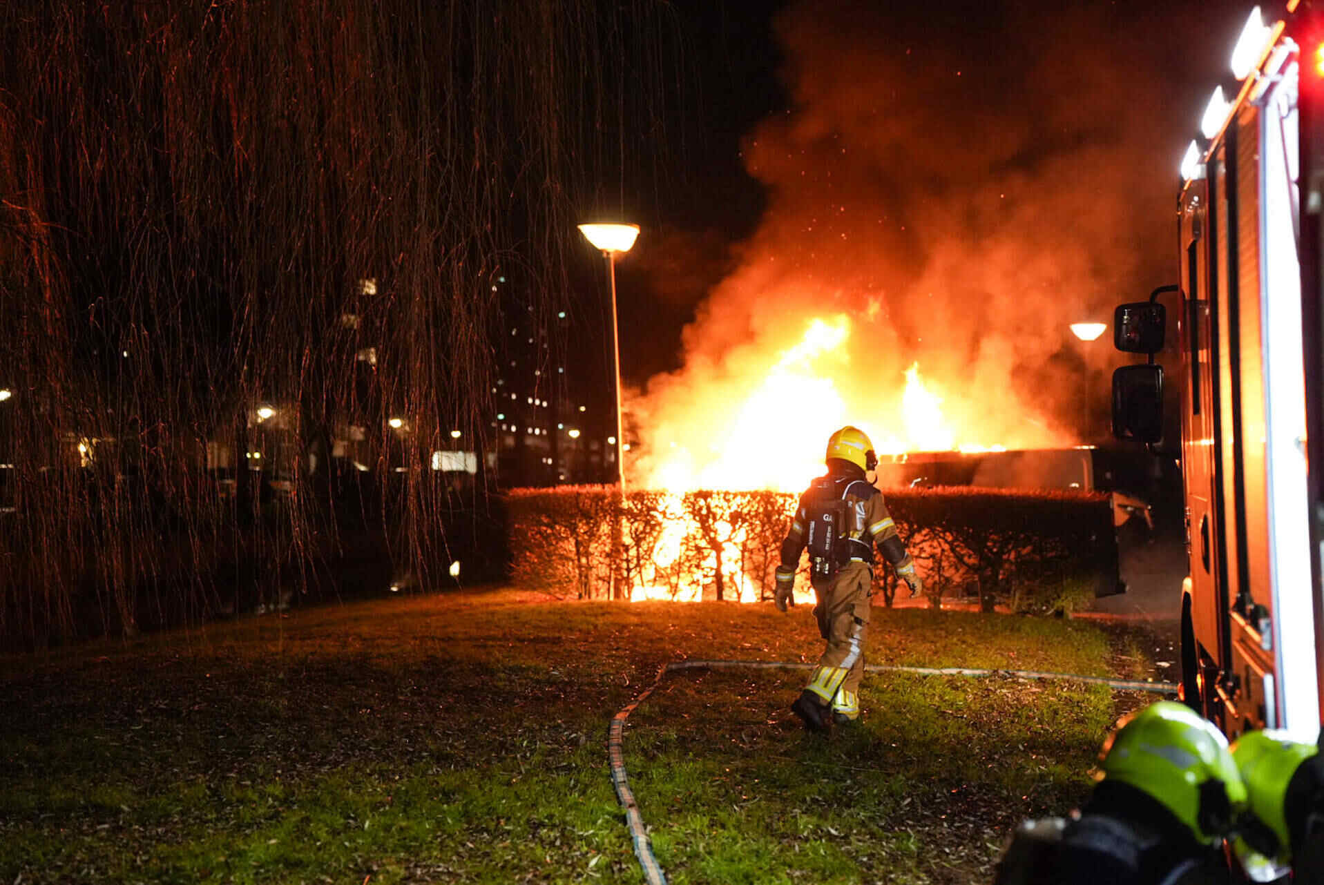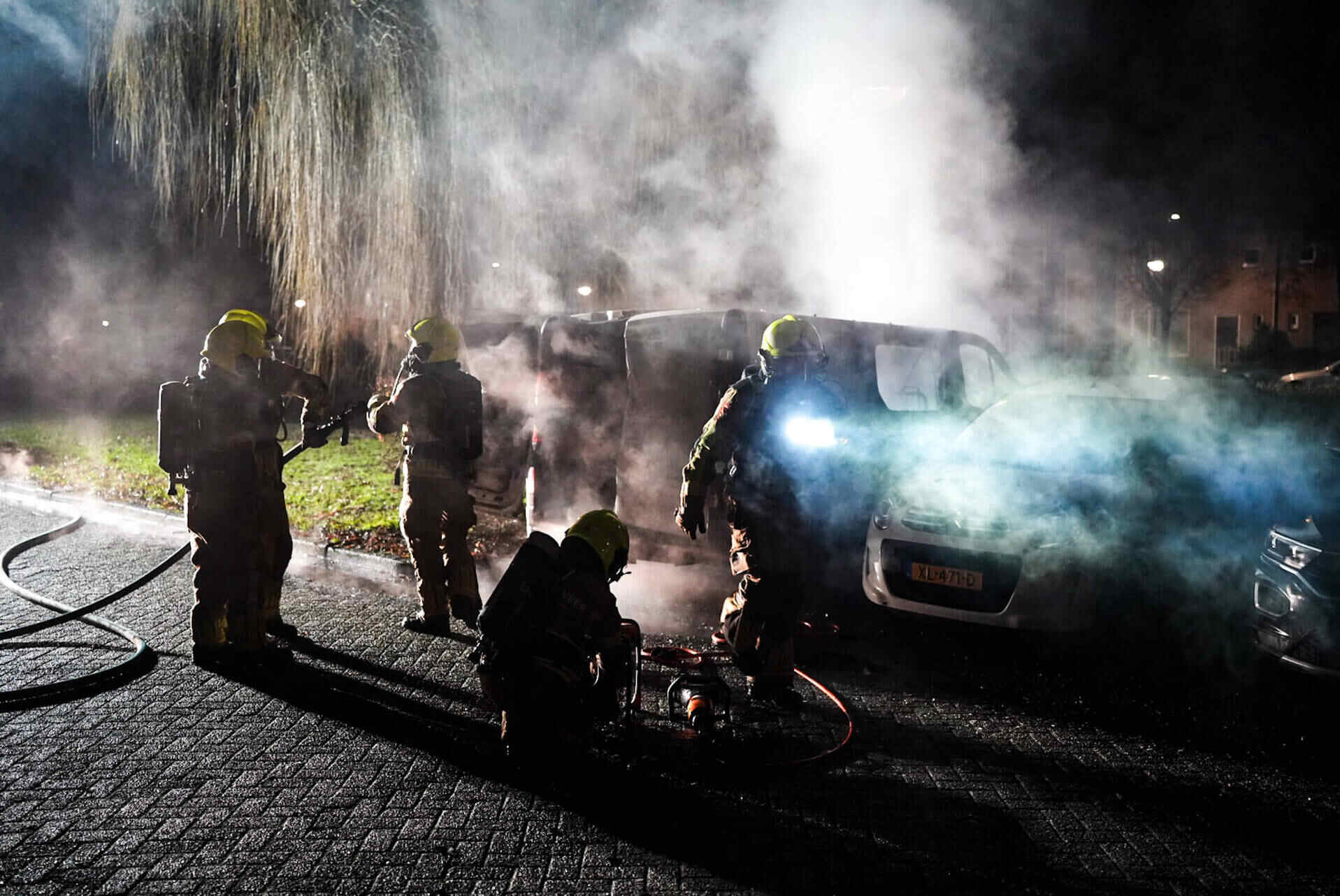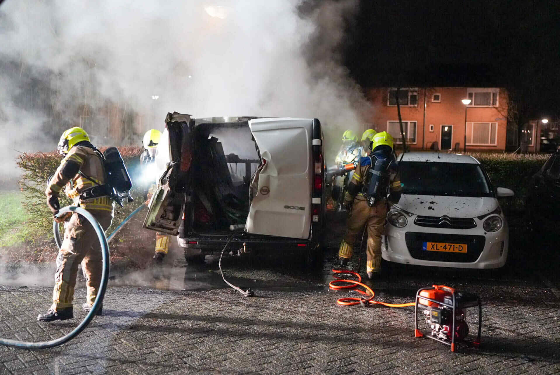 Bestelbus brandt uit in Waalwijk: tweede auto zwaar beschadigd, lantaarnpaal deels gesmolten