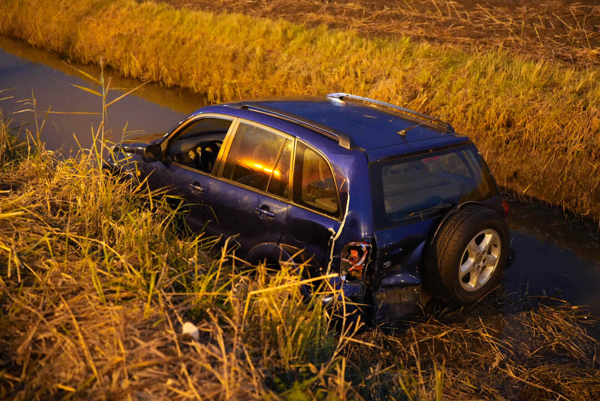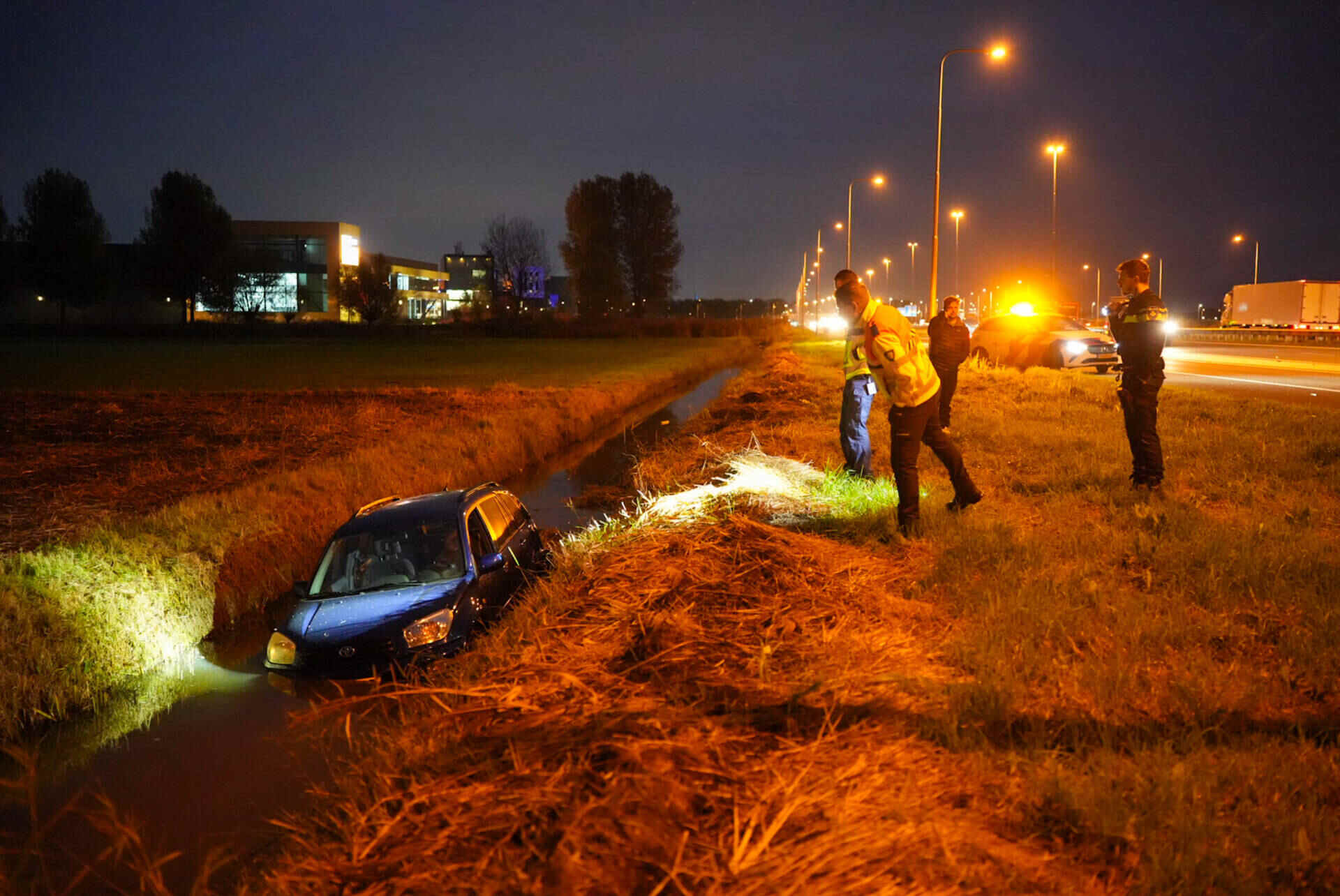 Een auto is vrijdagochtend rond 07.00 uur in de sloot beland na een aanrijding op de A59 tussen Waalwijk en Sprang-Capelle. Het andere voertuig, vermoedelijk een busje, reed na het ongeluk door.