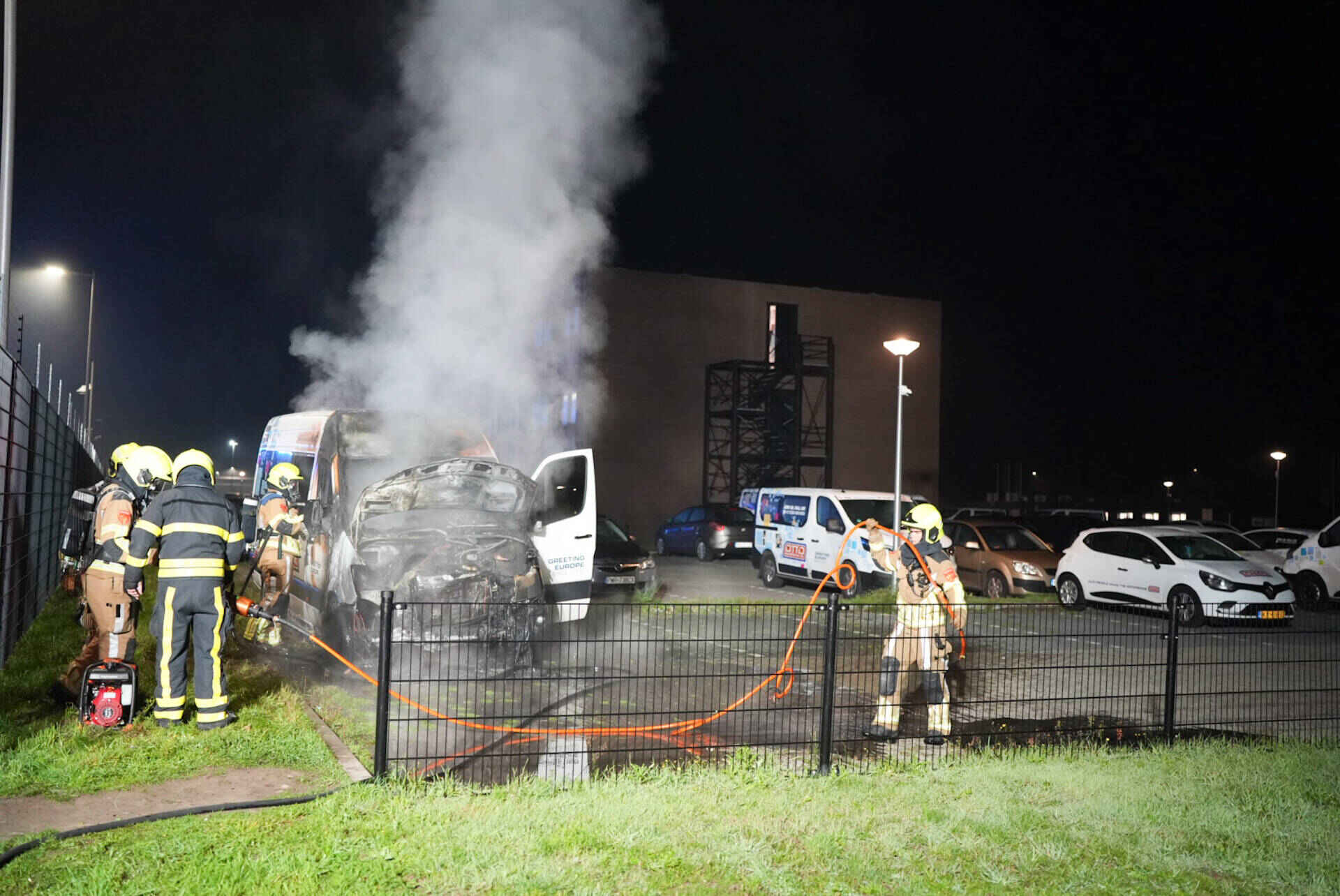 De melding van het incident kwam rond 03.00 uur binnen bij de hulpdiensten. De brand woedde op het parkeerterrein van het migrantenhotel, aan de kruising van de De Kroonweg en de Pakketweg. De brandweer en politie kwamen eropaf.