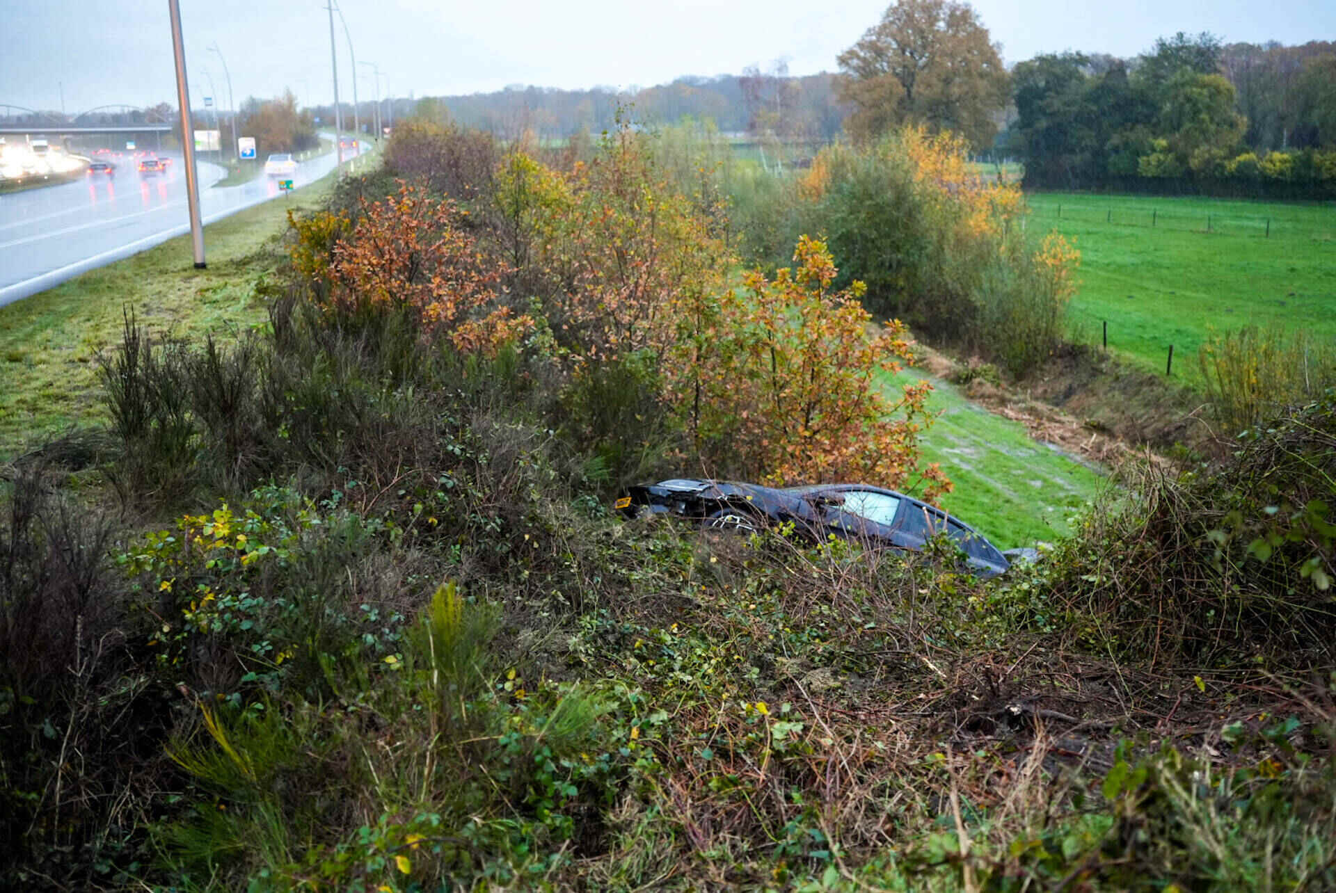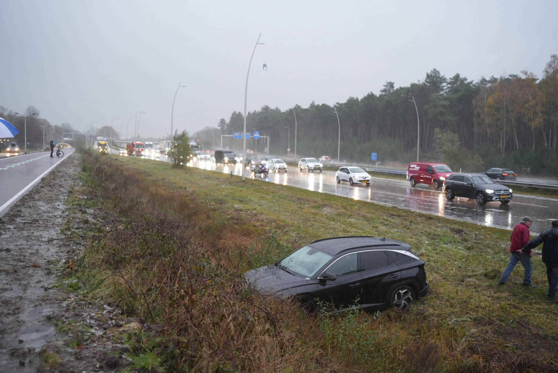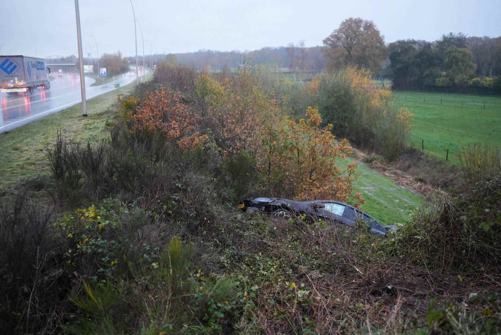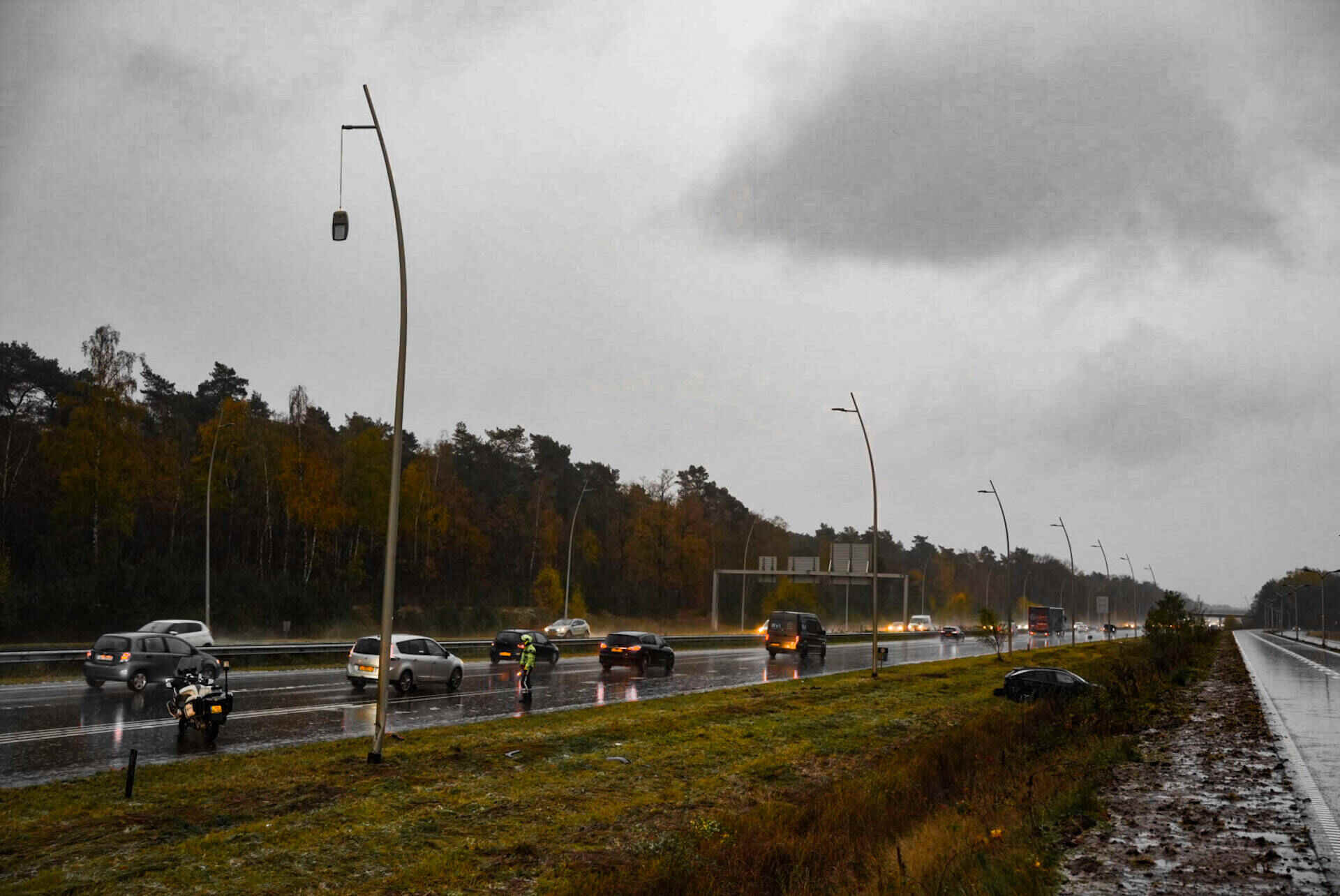 Niet veel later ging het mis op de andere rijbaan. In de richting van Loon op Zand slipte een auto ook van de weg, ter hoogte van het Efteling Hotel. Deze bestuurder botste tegen een lantaarnpaal en kwam tot stilstand in een sloot. Hij raakte lichtgewond.