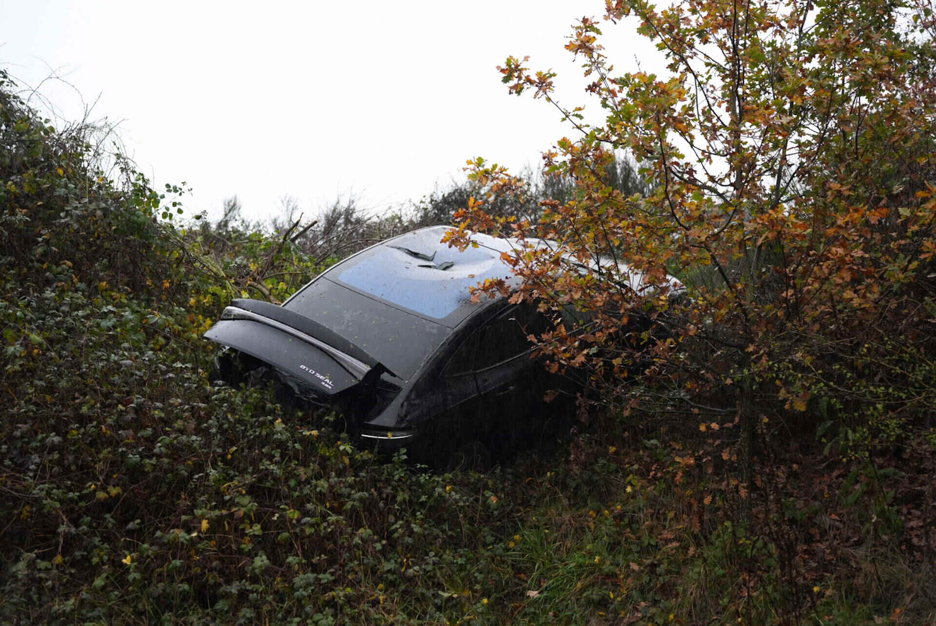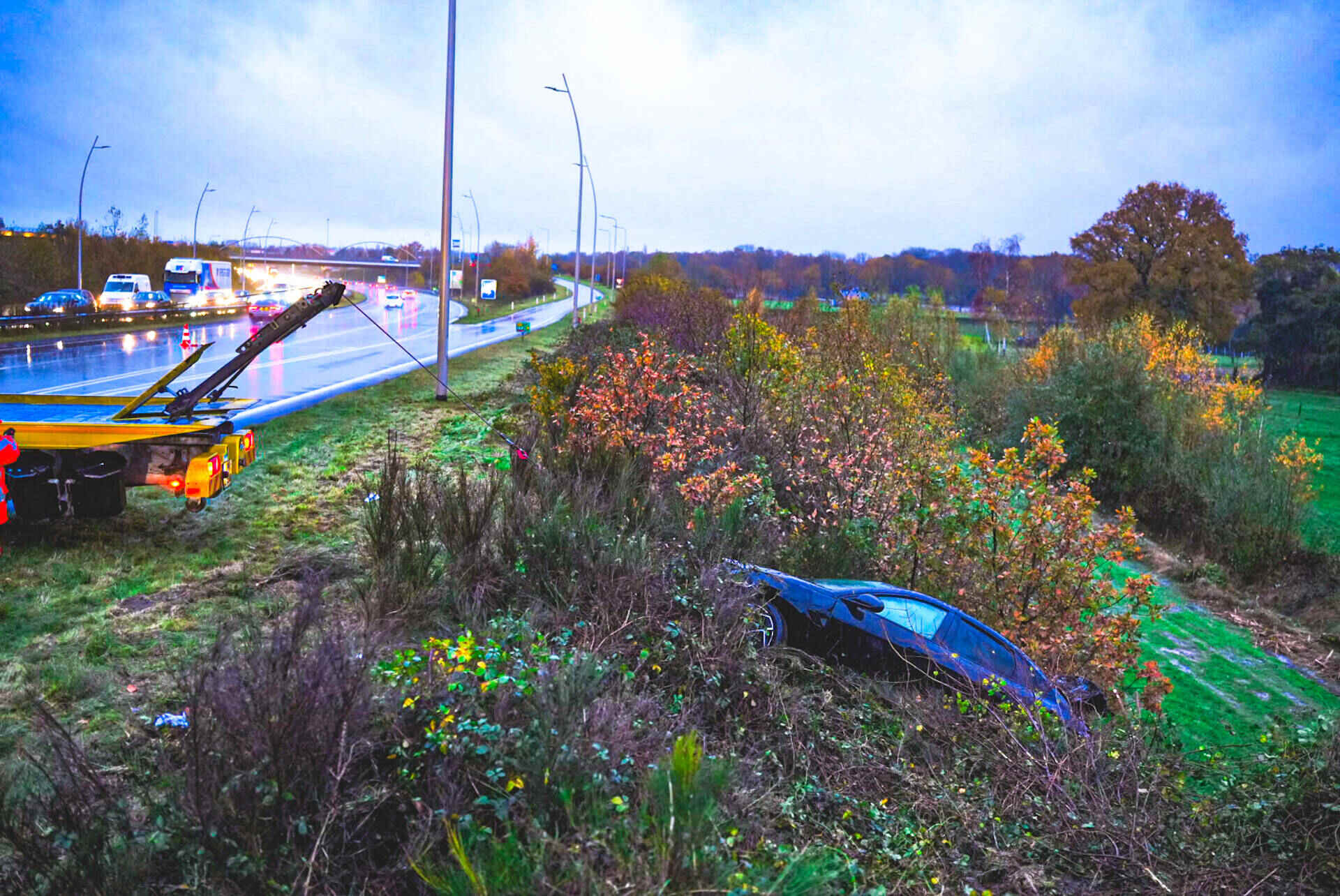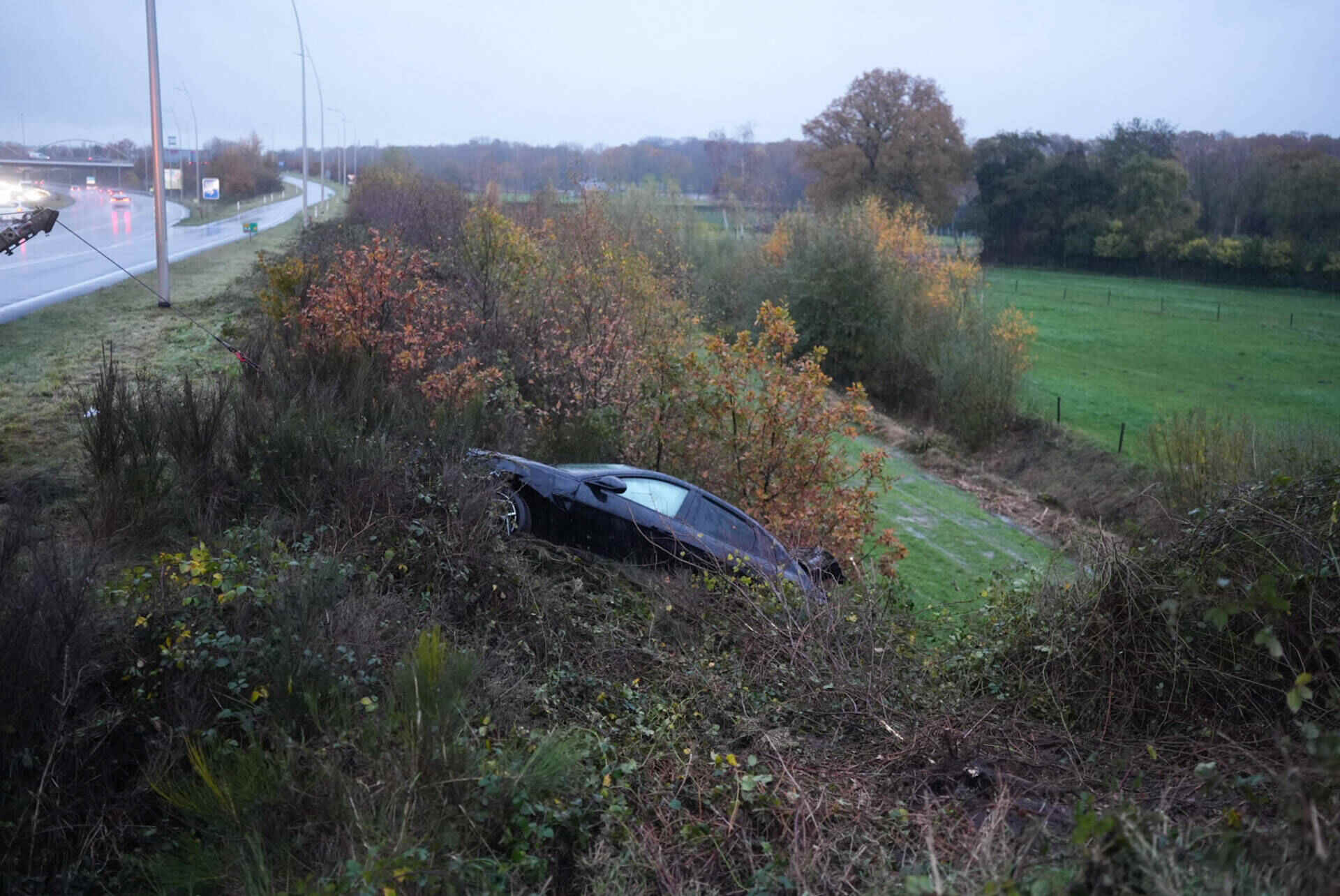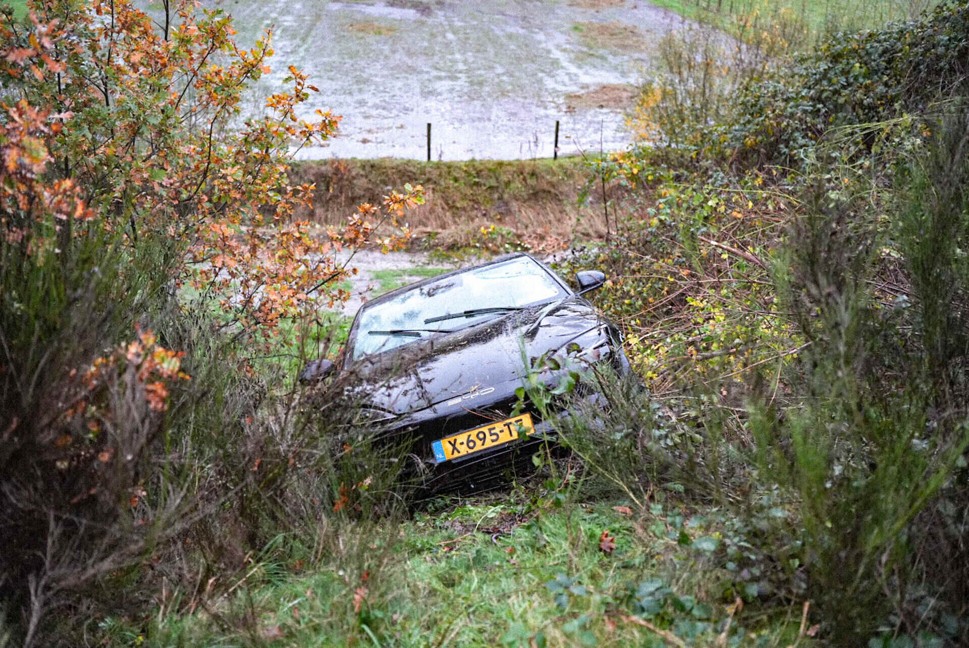 Niet veel later ging het mis op de andere rijbaan. In de richting van Loon op Zand slipte een auto ook van de weg, ter hoogte van het Efteling Hotel. Deze bestuurder botste tegen een lantaarnpaal en kwam tot stilstand in een sloot. Hij raakte lichtgewond.