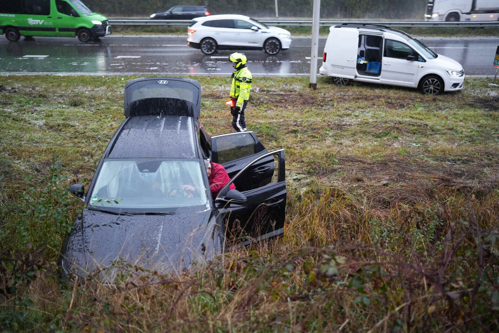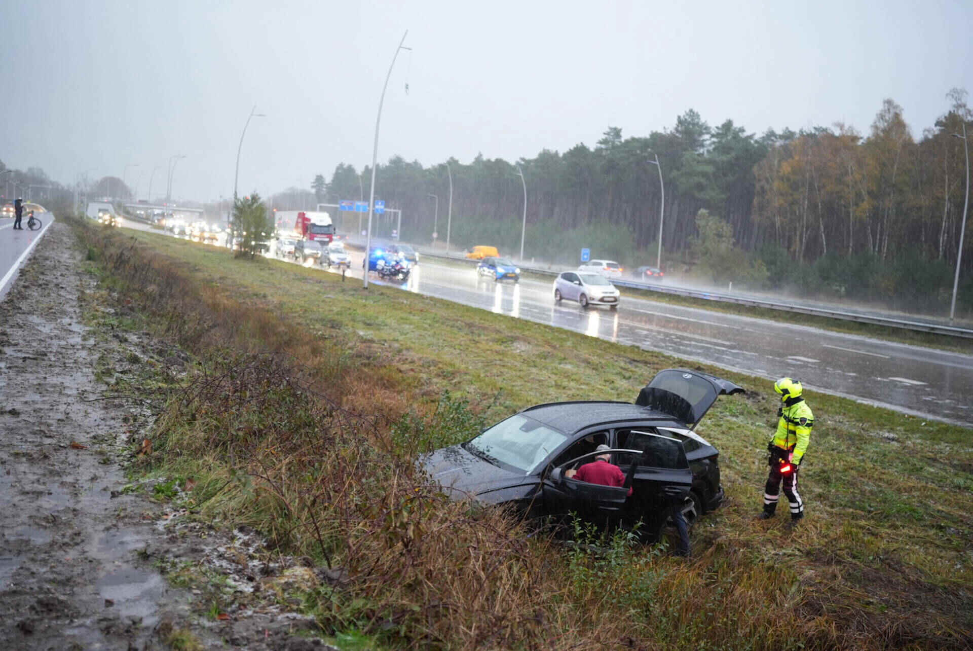 Dat gebeurde woensdag rond 15.40 uur. Eerst ging het mis in de richting van Waalwijk, ter hoogte van de afslag Sprang-Capelle. Daar raakte een bestuurder in een slip. Hij schoot van de weg en belandde in de bosjes. De automobilist raakte niet gewond.