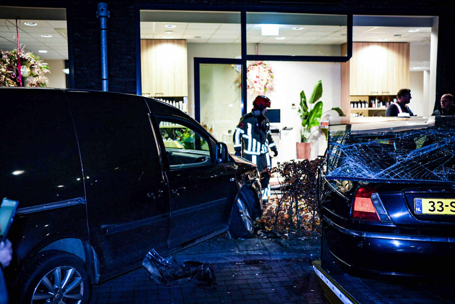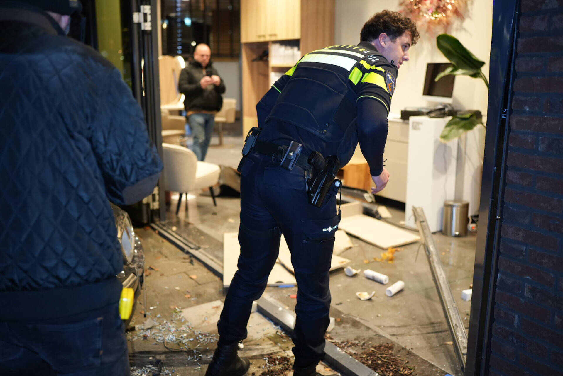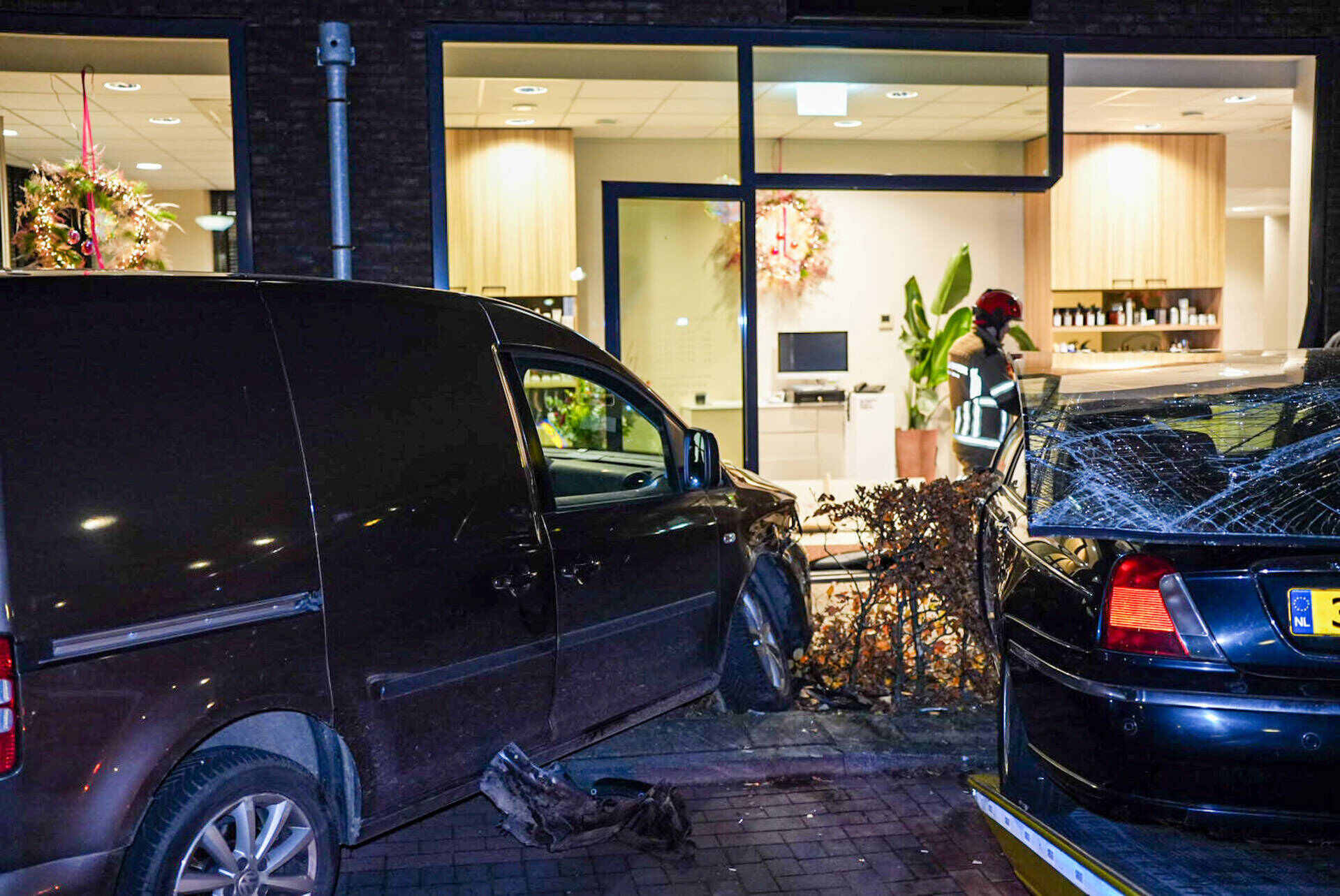 Wel was de schok groot toen het voertuig door de gevel reed. Een bergingsbedrijf sleepte de bestelbus en de gecrashte auto weg. Door een aannemersbedrijf wordt de beschadigde pui tijdelijk dichtgemaakt.