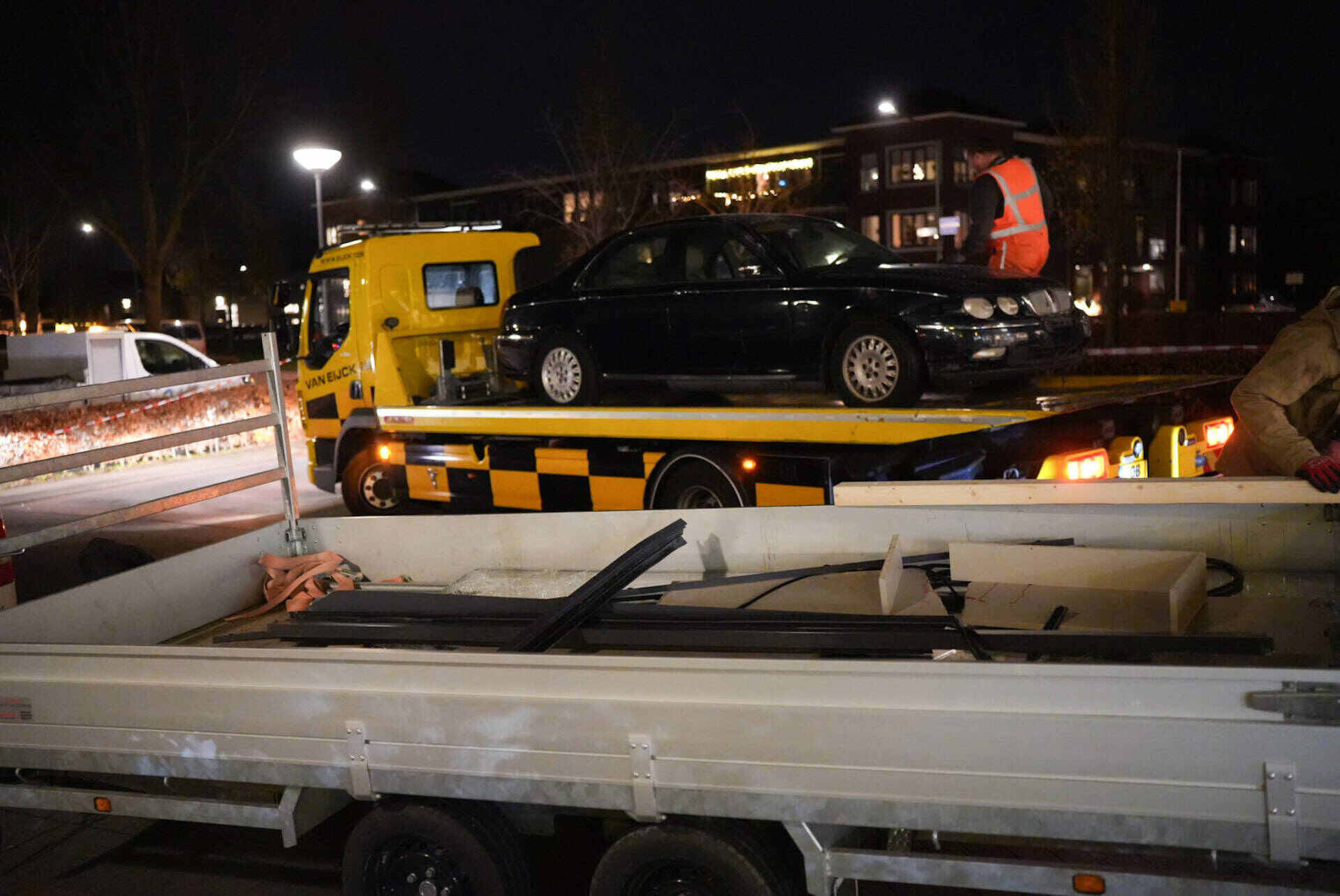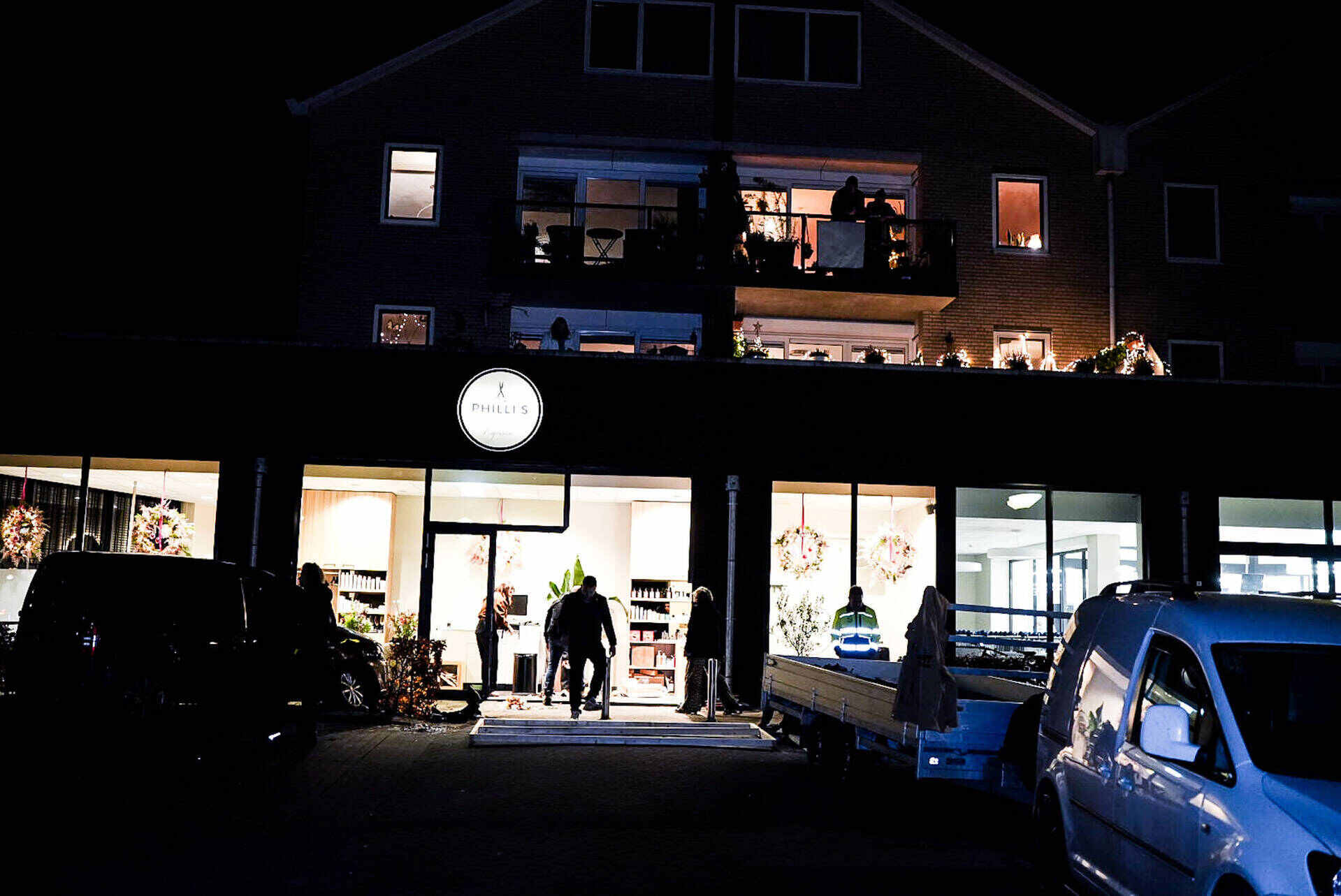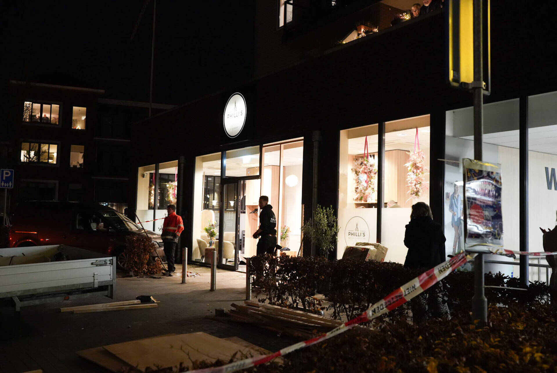Wel was de schok groot toen het voertuig door de gevel reed. Een bergingsbedrijf sleepte de bestelbus en de gecrashte auto weg. Door een aannemersbedrijf wordt de beschadigde pui tijdelijk dichtgemaakt.