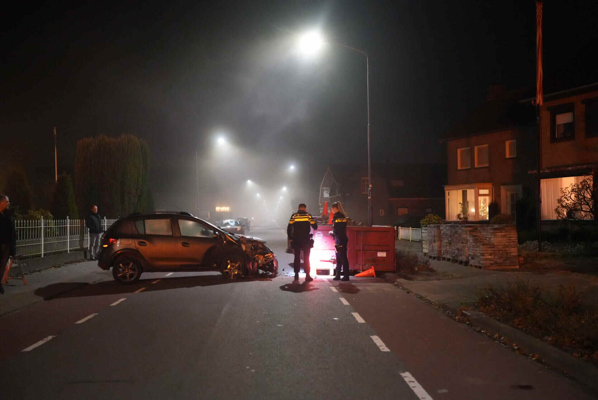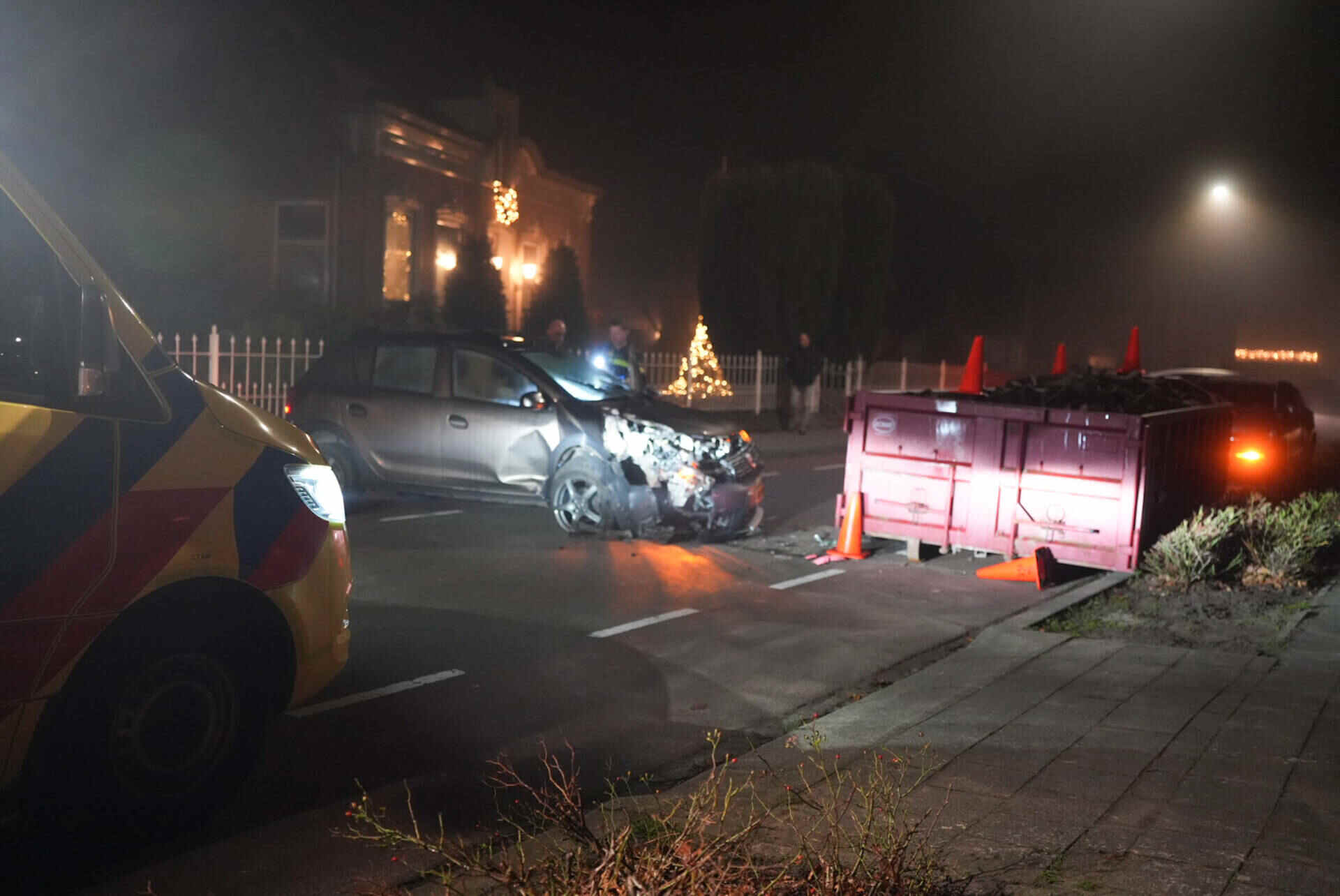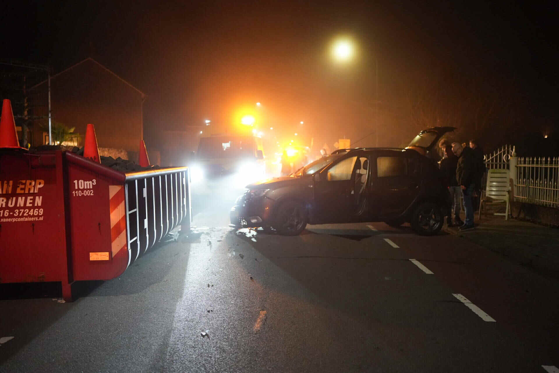De bestuurster was rond 22.30 uur net weggereden toen zij de container langs de weg over het hoofd zag. De auto klapte frontaal op de metalen bak. Hulpdiensten rukten uit en ambulancepersoneel heeft de vrouw ter plaatse onderzocht. Zij is met onbekende verwondingen naar het ziekenhuis gebracht.