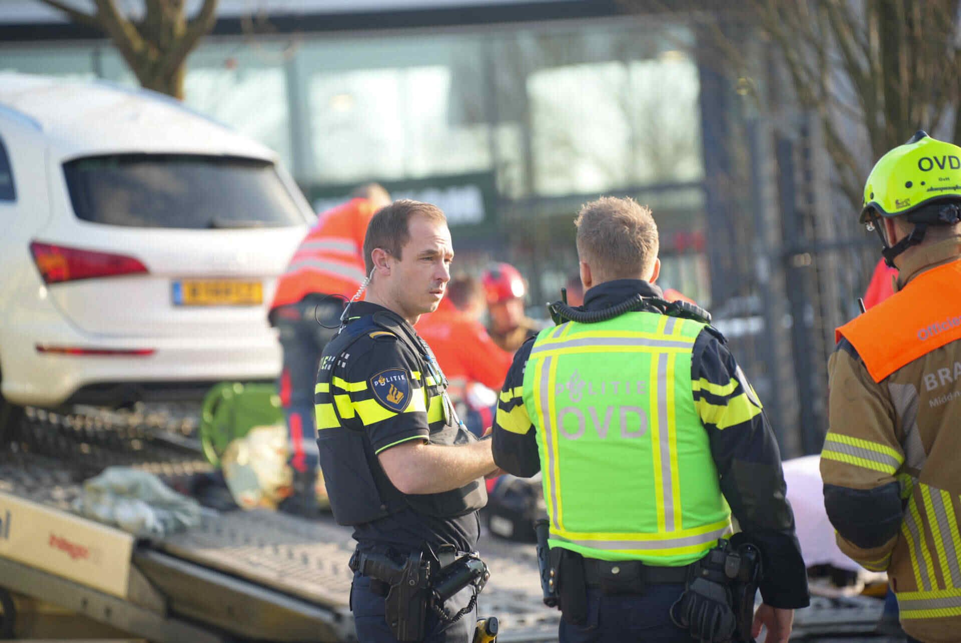 De omgeving is afgezet, terwijl de arbeidsinspectie onderzoek doet. De vrouw die de auto naar voren reed om te helpen, is door de politie meegenomen naar het bureau voor verhoor.